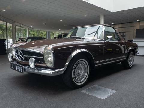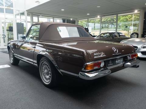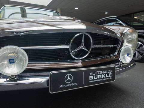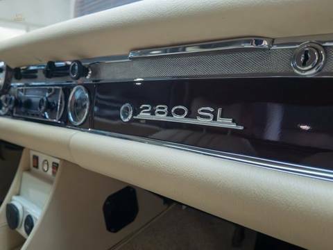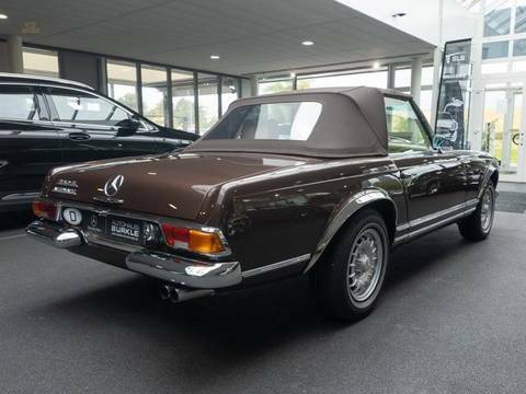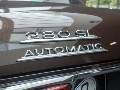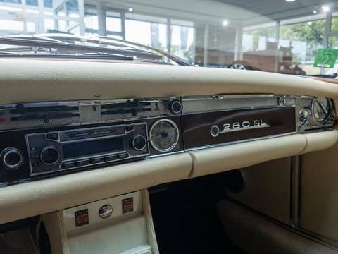 Dieser SL 280 Pagode wurde mit viel Liebe zum Detail restauriert und präsentiert sich optisch wie technisch in überzeugender Klassikerqualität. Die Kombination aus manganbraun metallic, cremefarbenem Leder und dem braunen Verdeck macht dieses Fahrzeug zu einer äußerst begehrten und stilvollen Variante.