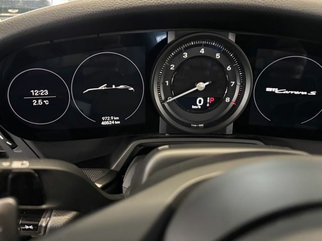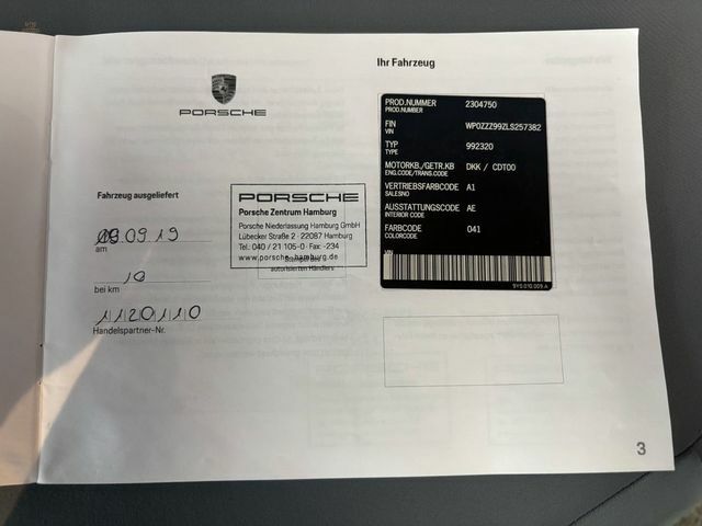 Außen-/Innenspiegel mit Abblendautomatik und Regensensor, Frontscheibe mit Bandfilter oben, Fzg. ohne Modellbezeichnung, Fzg. ohne Typbezeichnung auf den Kopfstützen, Lenkrad heizbar (GT Sport / Leder) mit Multifunktion und Schaltfunktion, LM-Felgen vorn/hinten: 8,5x20 / 11,5x21 (Carrera Classic Rad, glanzgedreht), Radnaben - Abdeckungen Porschewappen farbig, Reifen-Reparaturkit, Servolenkung Plus (geschwindigkeitsabhängig), Sitzheizung vorn, Sportsitze vollelektrisch (14-Wege) inkl. Memory-Paket