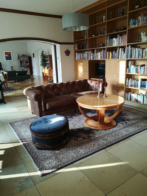 Die großzügige und gepflegte, zweistöckige Villa zeichnet sich durch eine gehobene Innenausstattung aus und steht zum Mai 2021 zum Verkauf. Wie für modern ausgestattete Immobilien üblich, gehören neben den zehn schönen Zimmern auch zwei Badezimmer sowie ein separates Gäste-WC zum Haus. Nennenswert sind insbesondere der großzügige Wohnbereich mit offenem Kamin, die hohen Decken und der schöne Blick durch bodentiefe Fenster in den parkähnlichen Garten.