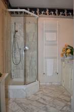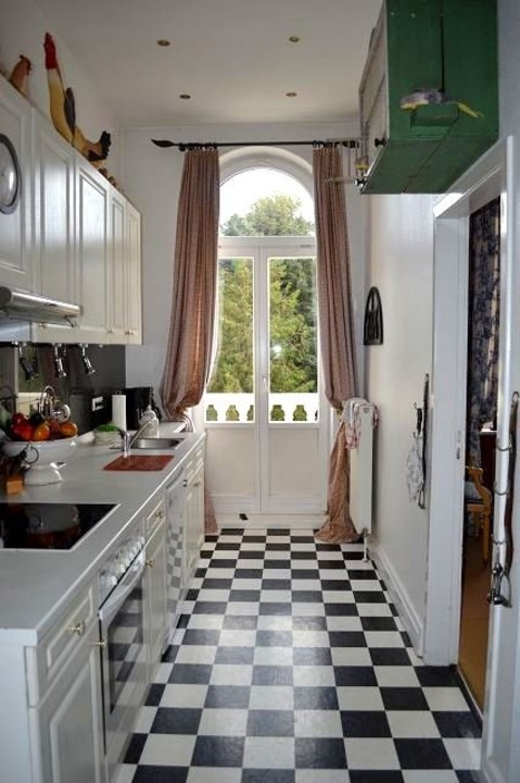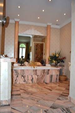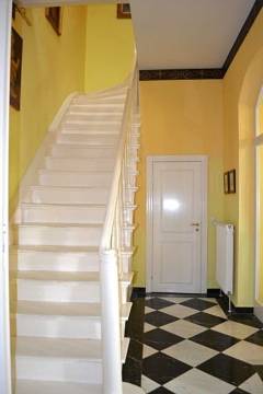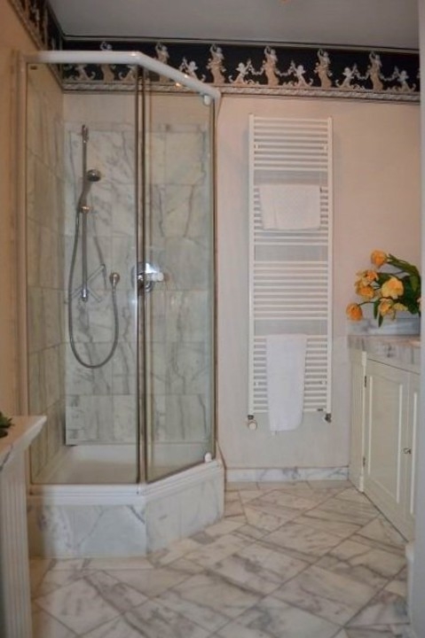 Im Haupthaus befindet sich die größte Wohnung mit knapp 280qm verteilt auf 2 Ebenen. Über ein imposantes Entrée mit schwarz-weißen Marmor-Bodenfliesen gelangt man in den großzügig geschnittenen Salon mit Zugang zur 100qm großen Terrasse und dem anliegenden Park. Ein Gäste-WC befindet sich auf gleicher Ebene. Im Obergeschoss liegen 4 weitere Räume. Auch hier spiegelt sich das perfekt abgestimmte festliche Ambiente in jedem Raum wieder. Hochwertige edle Materialien kombiniert mit stilvollem Interior runden das Gesamtbild optimal ab. Ein Schlafzimmer mit traumhaftem Bad en suite, ausgestattet mit rosé farbenen italienschen Marmor, lässt keine Wellnesswünsche offen. Auch bei dem zweiten Bad und dem separaten WC wurde bei den Materialien nicht gespart. Die Küche sowie das anliegende Esszimmer bieten Zugang zum Balkon. Alle anderen Wohnräume bieten einen unverbaubaren Blick in den gepflegten Garten.