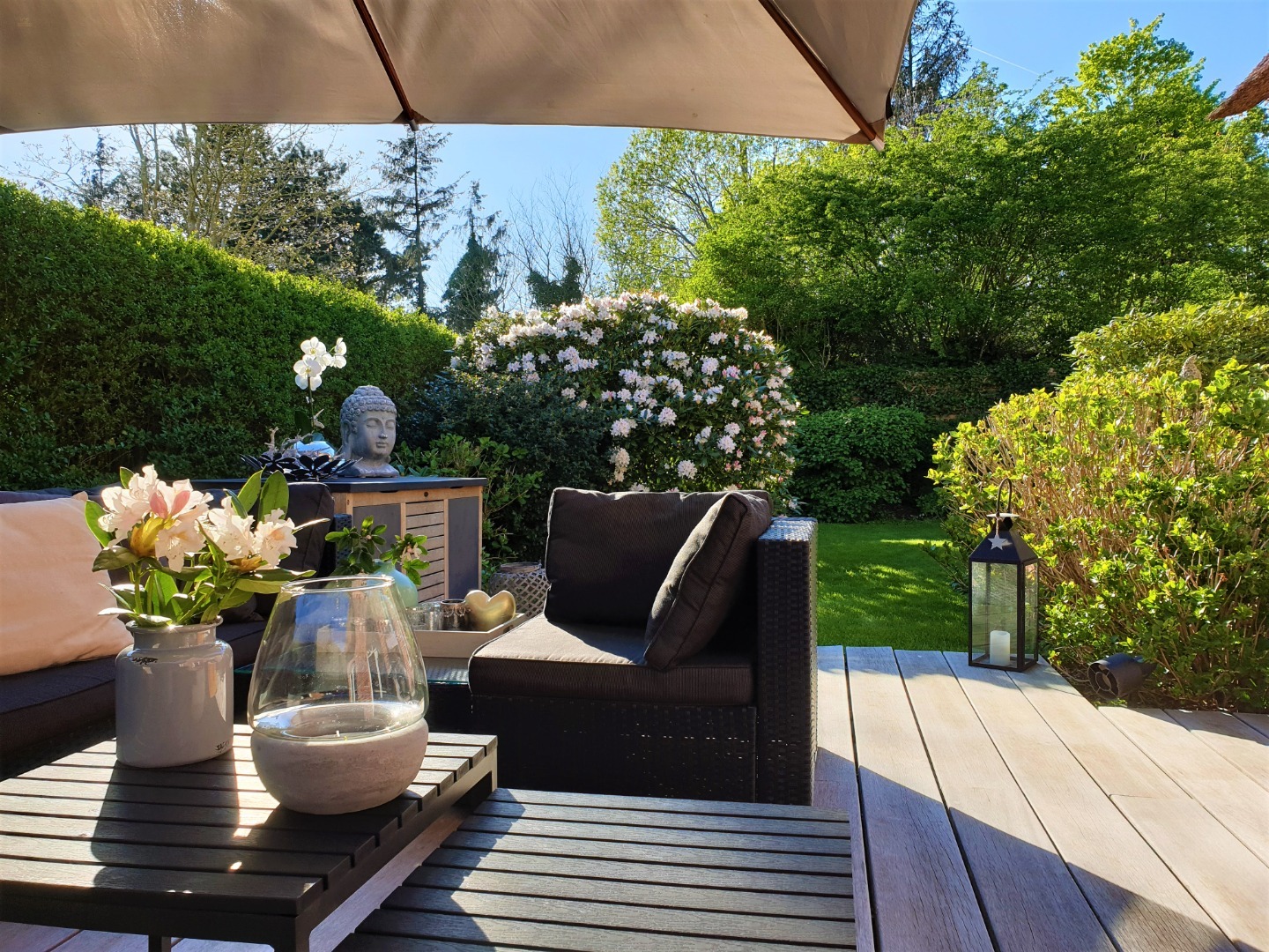 Eine herrliche Gartenlandschaft umarmt das Haus und vervollständigt die Harmonie zwischen Haus und Garten.