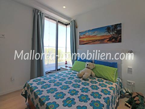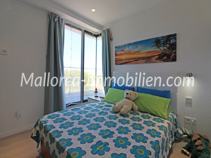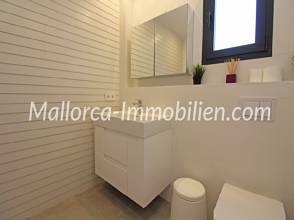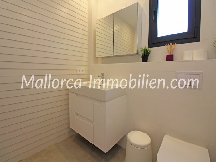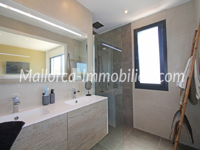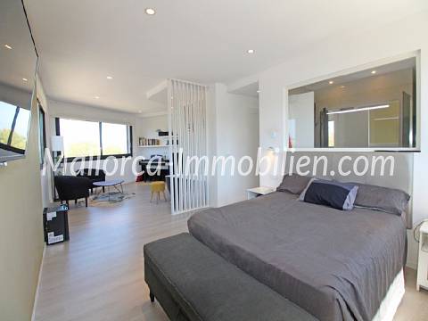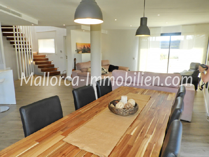 Schon beim Eintreten beeindruckt das großräumige Wohnzimmer mit Kamin, der Essbereich mit Ausgang zur Terrasse und dem Poolbereich. Die hochwertige offene Küche lässt keine Wünsche offen. Das Hauptschlafzimmer ist mit integriertem Bad und freistehender Badewanne sowie einer angrenzenden Ankleide ausgestattet. Von der großen Dachterrasse genießt man einen einmaligen Blick auf die Playa de Palma.