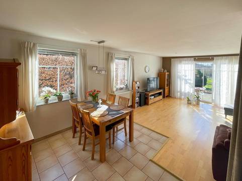 Erdgeschoss: Großer Wohn-/ Essbereich mit angrenzender Einbauküche, Eingangsbereich mit integrierter Garderobe, Gäste-WC, HWR für Heizungsanlage, Waschmaschine / Trockner.