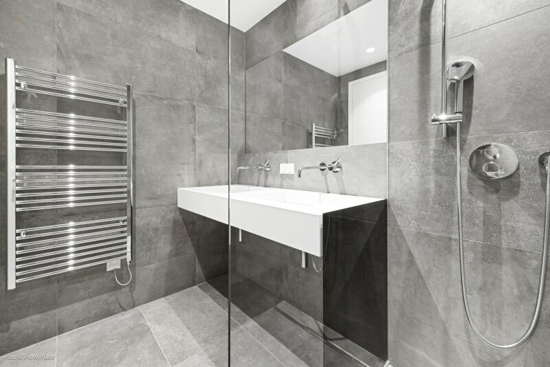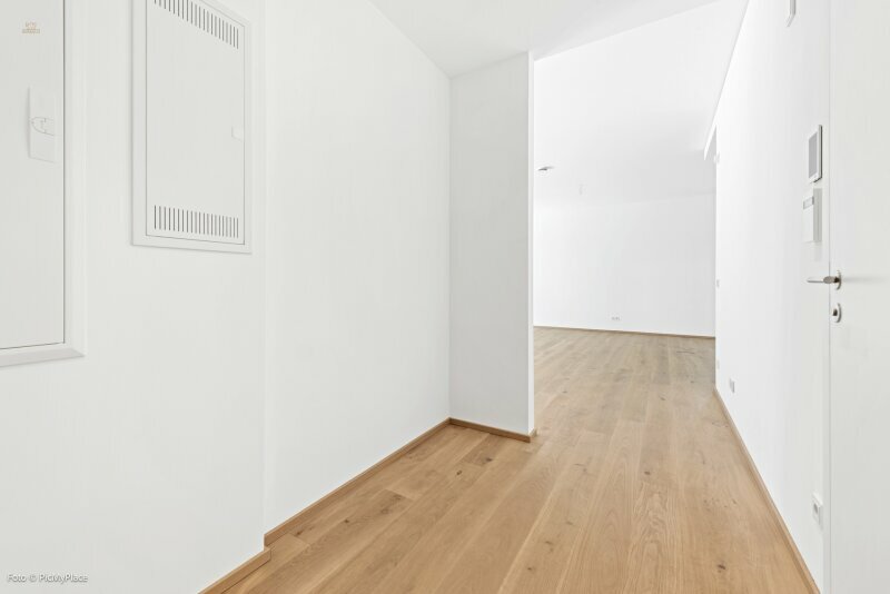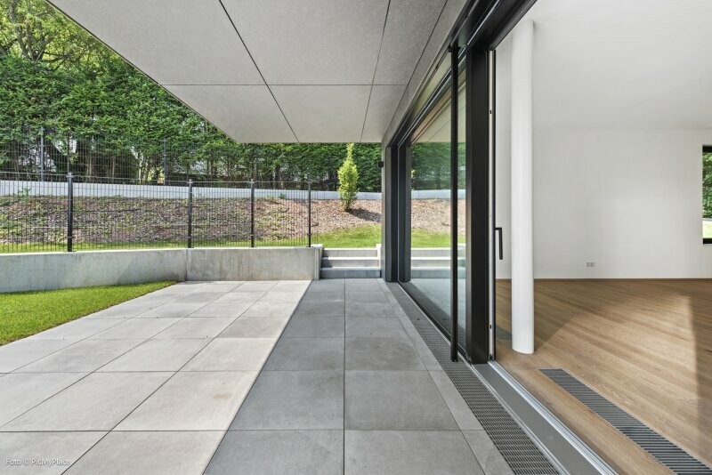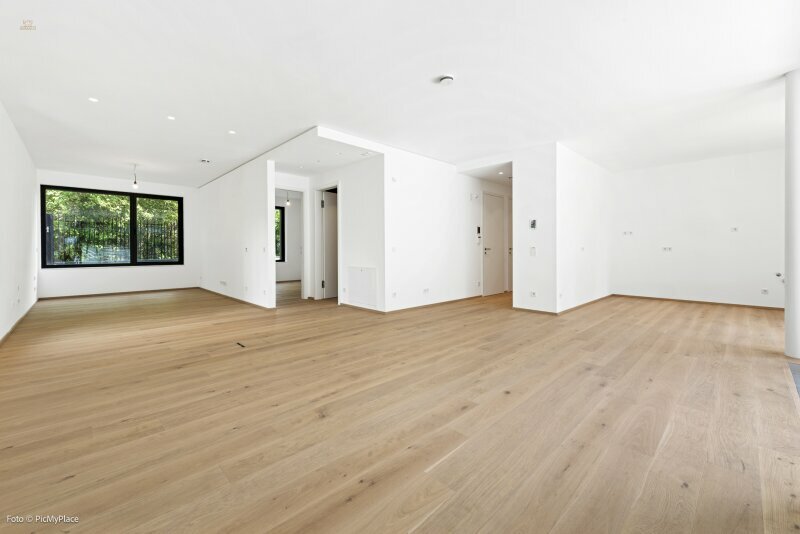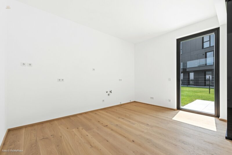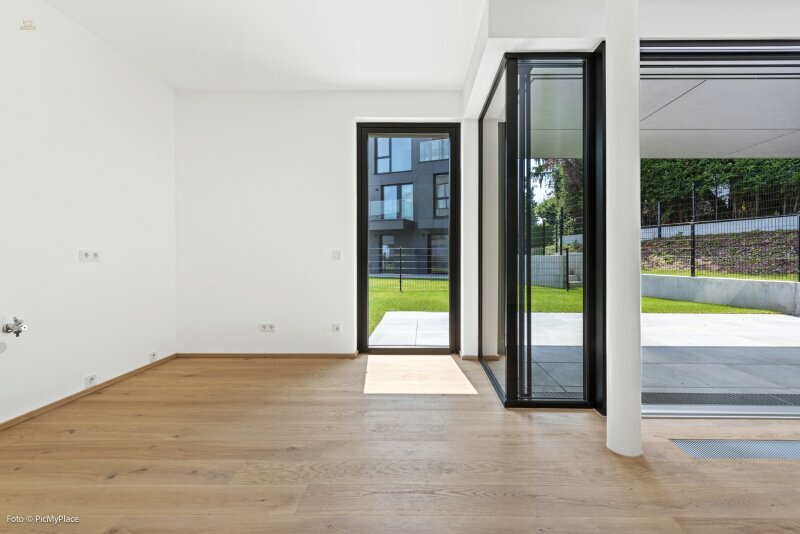 Sie betreten die Wohnung und gelangen in den Eingangsbereich. Dieser bietet dank einer praktischen Nische genügend Platz für jegliche Garderobe. Weiter führt Sie der Eingangsbereich direkt in den hellen und offenen ca. 62 m2 großen Wohnraum. Eine geschickte Raumtrennung schafft es den Raum in mehrere Bereiche zu gliedern. Hier haben Sie ausreichend Platz und Freiraum ihn nach Ihren Wünschen frei zu gestalten. Von Wohnbereich aus gelangen Sie auf die knapp 26 m2 große Terrasse und den eigenen Garten, welcher Ihnen die Möglichkeit zum Entspannen bietet. Über den Flur gelangen Sie rechterhand zu den weiteren Räumlichkeiten der Wohnung. Das Zimmer ist äußerst geräumig und aufgrund der großen Terrassentüren überaus hell. Direkt daneben befindet sich das Badezimmer, welches mit zwei Waschbecken und einer großen begehbaren Dusche ausgestattet ist. Das separate WC und der Abstellraum befinden sich direkt neben der Eingangstüre.