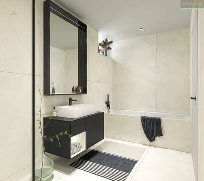 Obergeschoß: 2 Schlafzimmer, Bad mit Doppelwaschbecken, Dusche und WC, 7 m² Balkon