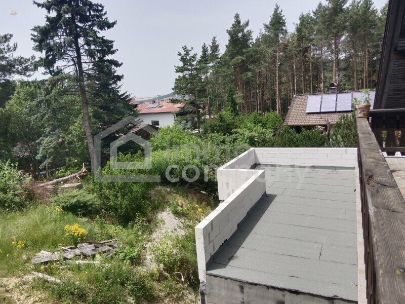 Über die Vollholztreppe gelangen Sie ins Erdgeschoss mit der 74m² großen südseitigen Terrasse. Hier wurde bereits das Streifenfundament für die Erweiterung der Terrasse auf insgesamt 105m² errichtet.