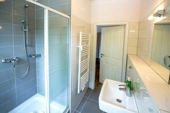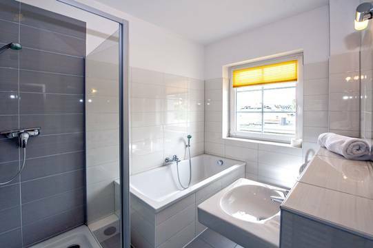 Die einheitlich mit Vinyl-Designboden ausgelegte Wohnung verfügt weiterhin über 2 Schlafzimmer mit Doppelbetten und Flatscreen TV sowie Zugang zu modernen Ensuite-Bädern. Beide Bäder sind mit Dusche, Handtuchheizung und Fenster ausgestattet, eines zusätzlich mit einer Badewanne.