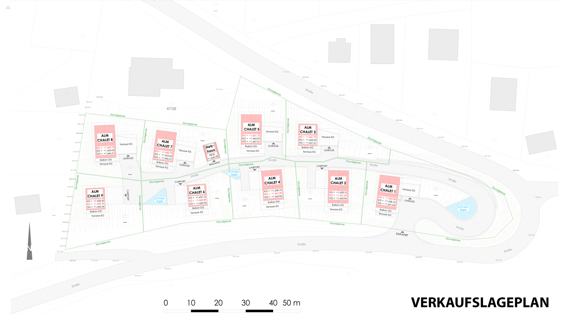Alle 9 Chalets verfügen über zwei bis vier Schlafzimmer, 1 bis 2 Bäder sowie über eine Sauna und 2 Garagen- oder Carportstellplätze und werden auf eigenen, großzügigen Grundparzellen errichtet und sind somit komplett unabhängig voneinander.