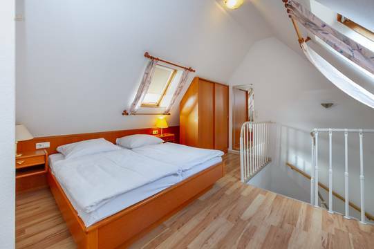 An den Eingangsbereich mit Garderobe und Abstellraum schließt sich die voll ausgestattete Küche mit Sitzecke an. Über eine Holztreppe gelangt man ins erste Obergeschoss. Hier befinden sich das Badezimmer mit Fenster, Dusche und WC, ein Schlafzimmer mit zwei Einzelbetten und das großzügige Wohnzimmer mit Blick zum See. Das zweite Schlafzimmer mit Doppelbett liegt im zweiten Obergeschoss unter dem Dach und hat ebenfalls ein Fenster mit Blick über den See.