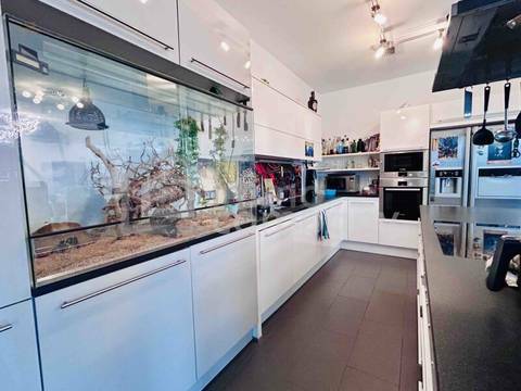 Großzügige, lichtdurchflutete Räume mit modernem Design schaffen eine einladende Wohlfühlatmosphäre. Der offene Wohn-Essbereich mit direktem Zugang zur Sonnenterrasse, einem hochwertigen Grillplatz und einem idyllischen Teich bildet das Herzstück des Hauses – ein Ort des Zusammenseins und Genusses für die ganze Familie.