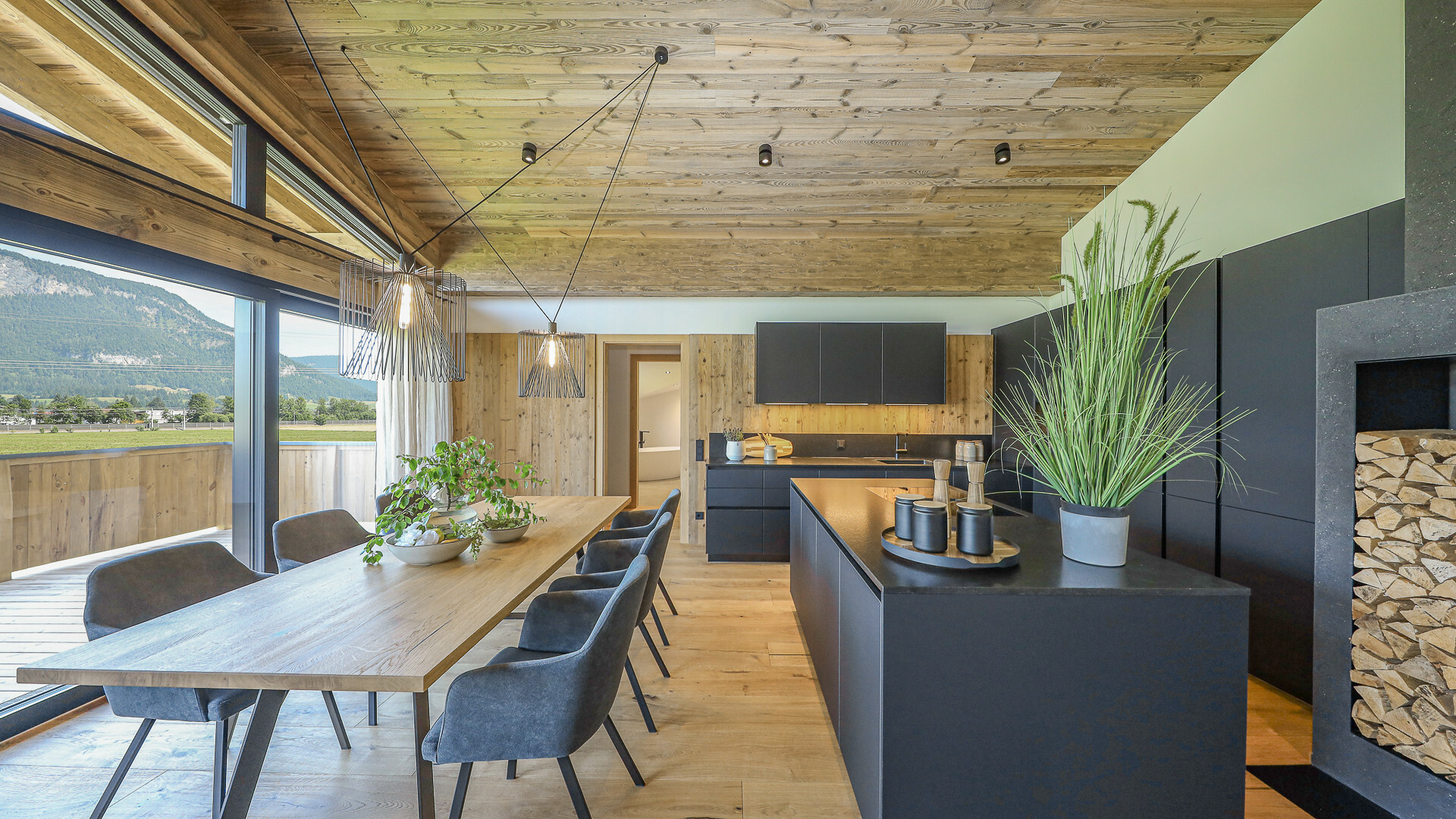 Von hier aus gelangen Sie in den ca. 57 m² großen Wohn-Essbereich mit offener Küche, Kamin, Sitzecke und Sichtdachstuhl. Der Sichtdachstuhl, die damit verbundene Raumhöhe und großen Glasfronten in Richtung des Wilden Kaisers sorgen für ein besonderes Wohnerlebnis.