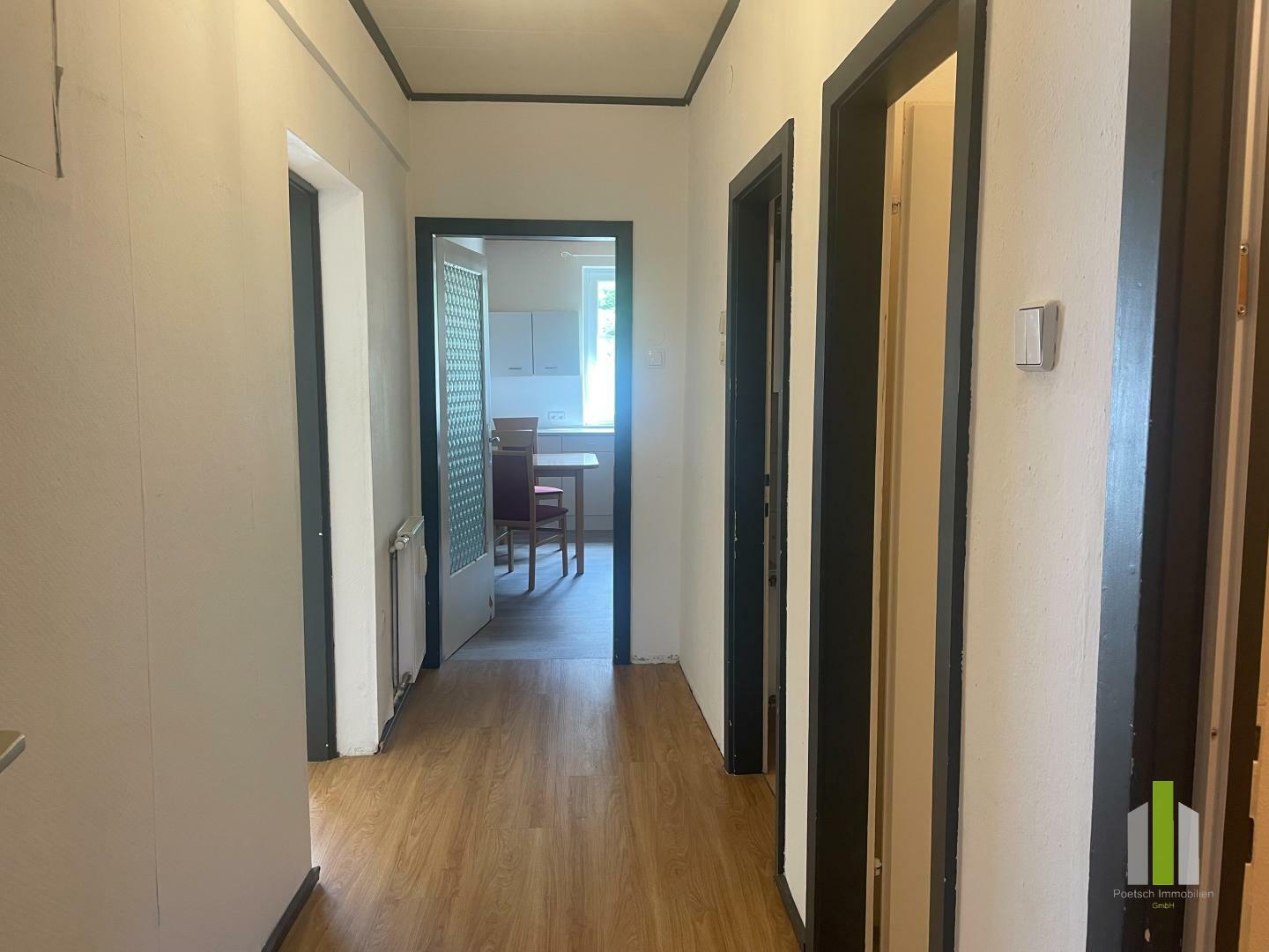 Die Raumaufteilung ist durchdacht: Über den Flur gelangt man geradeaus in die Küche, links in das Wohnzimmer. Vom Wohnzimmer aus führt je eine Tür in das Schlafzimmer sowie in ein weiteres Zimmer, ideal als Kinder- oder Arbeitszimmer nutzbar. Vom Flur aus erreicht man außerdem einen praktischen Abstellraum mit Waschmaschinen- und Trockner-Anschluss, ein separates WC sowie das Badezimmer mit Badewanne und Warmwasserboiler, der über Nachtstrom betrieben wird.