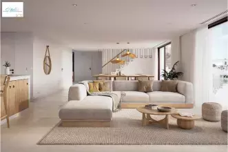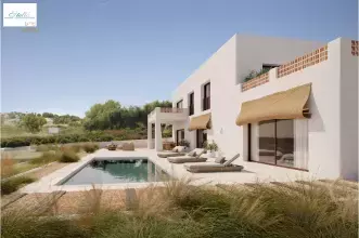 In einer der begehrtesten Gegenden von Moraira, in der ruhigen und grünen Umgebung von Benimeit, befindet sich diese außergewöhnliche, neu gebaute Villa im markanten modernen Ibiza-Stil. Auf einem sonnigen, nach Süden ausgerichteten Grundstück von 800 m² gelegen, verbindet dieses elegante Anwesen auf perfekte Weise zeitgenössischen Luxus mit mediterranem Flair. Die Villa wurde mit einem offenen Grundriss entworfen, der Geräumigkeit, natürliches Licht und ein konstantes Gefühl der Ruhe vermittelt. Warme Materialien und natürliche Details verleihen jedem Winkel Charakter und Harmonie. Das Herzstück des Hauses bildet ein heller Wohnbereich mit hohen Decken, der ein geräumiges Wohnzimmer und eine Designerküche mit zentraler Kochinsel und hochwertigen Geräten umfasst. Von hier aus öffnen sich große Fenster zur Hauptterrasse und ermöglichen den Genuss der Aussicht nach draußen. Das Anwesen verfügt über drei komfortable Schlafzimmer und zwei elegante Badezimmer. Die Master-Suite verfügt über ein eigenes Bad und direkten Zugang zu einer großen Terrasse mit Meerblick, ideal, um den Tag in Ruhe zu beginnen. Die anderen Schlafzimmer sind ebenso geräumig und bieten eine gemütliche Atmosphäre für Familienmitglieder oder Gäste. Der Außenbereich ist für das Leben im Freien konzipiert: Eine große, sonnendurchflutete Terrasse führt zum privaten Pool, der von Ruhezonen umgeben ist, die sich perfekt zum Entspannen oder zum Empfang von Besuchern eignen. Das Grundstück verfügt auch über einen privaten Parkplatz. Diese Villa ist perfekt für diejenigen, die Ruhe, Privatsphäre und Panoramablicke schätzen, ohne auf eine ausgezeichnete Lage in der Nähe des Zentrums von Moraira und seiner Strände verzichten zu müssen. Ein Immobilienjuwel in einer der besten Lagen der Costa Blanca. Der Baubeginn ist für Ende 2025 vorgesehen (auf Anfrage).