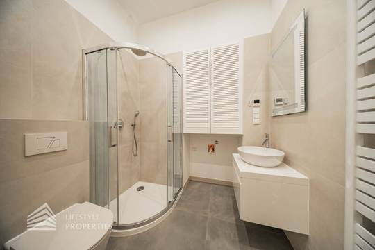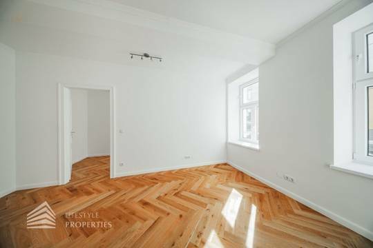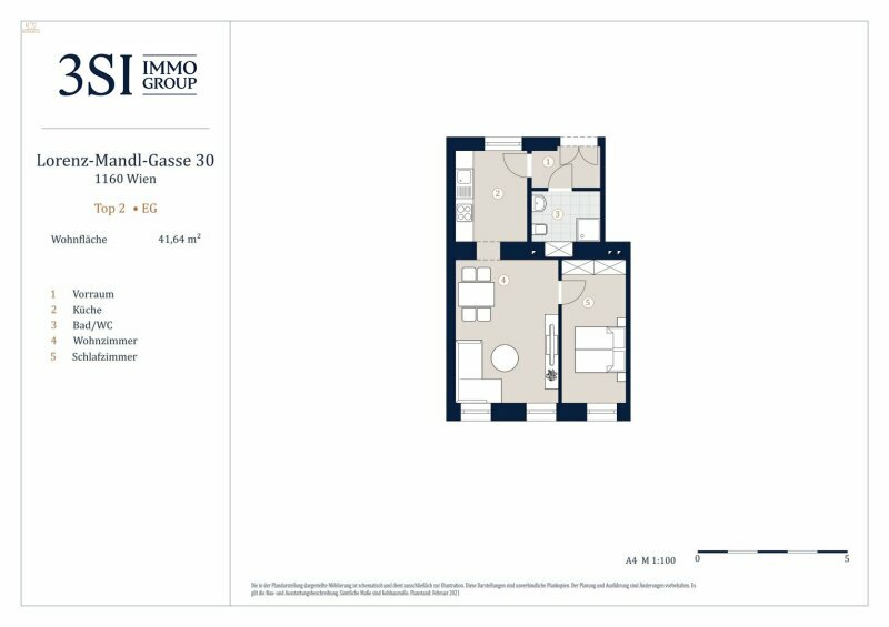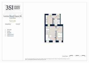 Die Wohnung hat eine Größe von ca. 41,64 m² ist ein Erstbezug und befindet sich im EG eines Stilaltbaus. Sie gliedert sich in einen Vorraum, ein Wohnzimmer, ein Schlafzimmer, eine Küche, ein Bad mit Dusche, Waschmaschinenanschluss und WC.