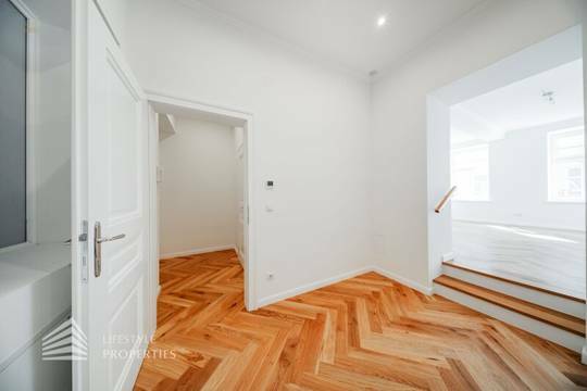 Diese klassische und gepflegte, um 1900 erbaute Eckliegenschaft umfasst ein Erdgeschoß, 3 Regelgeschoße, ein ausgebautes Dachgeschoß sowie ein Kellergeschoß. Der äußere elegante Altbau-Charakter der Fassade setzt sich auch im Inneren mit Stuck- und Stilelementen im Entrée und dem Stiegenhaus fort.
