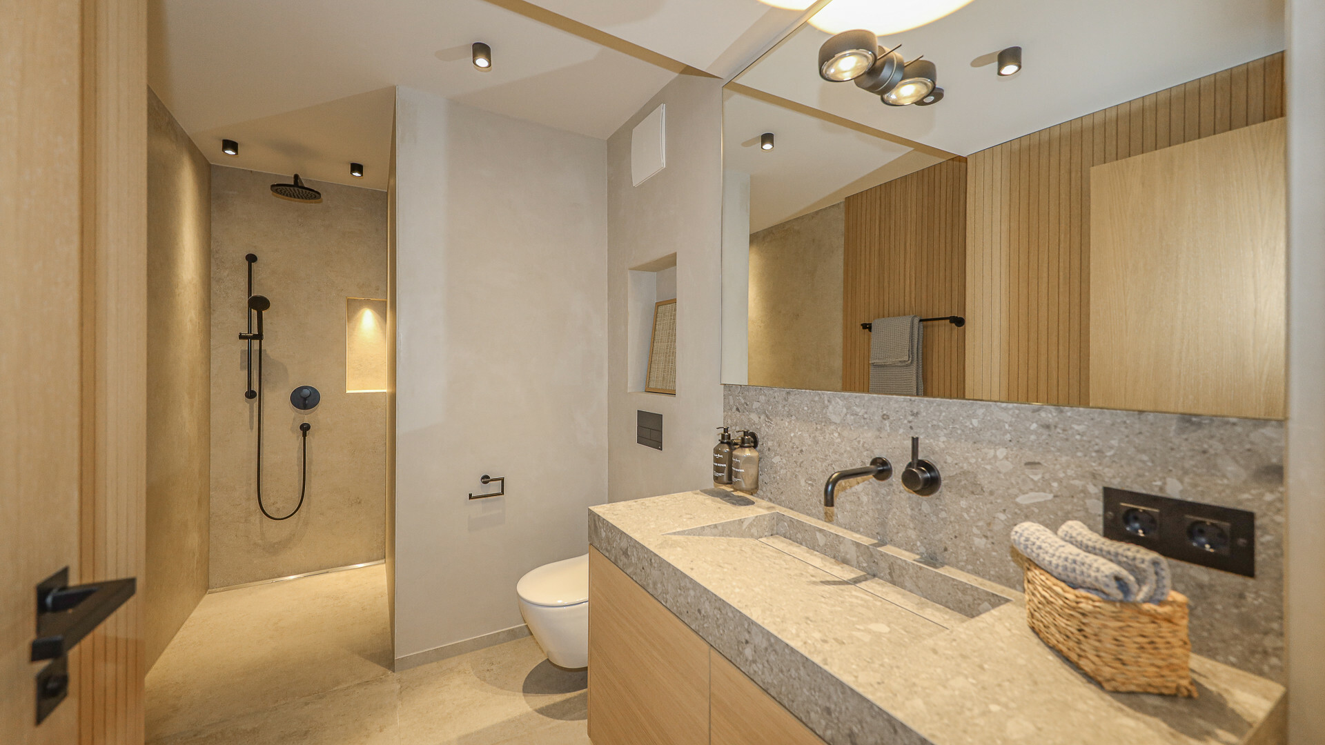 Weiters verfügt die Wohnung über ein komfortables Masterschlafzimmer mit Ankleide und Bad en Suite, mit Dusche, Badewanne und Doppel-Waschtisch.