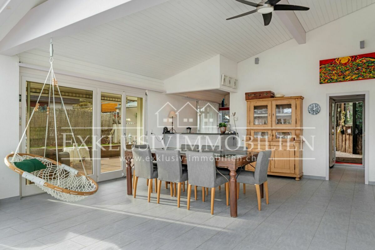 Draussen erwartet Sie ein idyllischer Gartenbereich mit Pergola und Cheminée - ideal zum Entspannen oder für gesellige Stunden. Die Einliegerwohnung eignet sich perfekt als Gäste-, Büro- oder Mietobjekt. Ergänzend dazu bieten die Gewerberäumlichkeiten vielseitige Nutzungsmöglichkeiten.