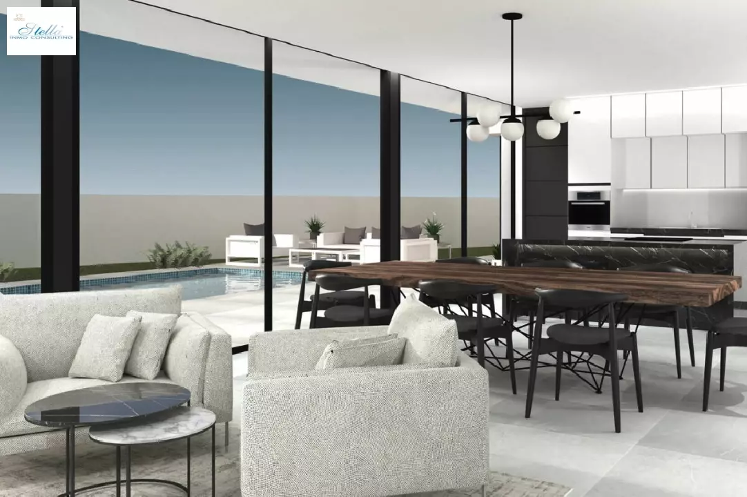 Zeitgenössisches Villenprojekt zum Verkauf in Moraira.Das Anwesen besteht aus drei Etagen mit drei Schlafzimmern, drei Bädern, einer Toilette, einer offenen Küche, die zum WohnEsszimmer hin offen ist, und einem InfinityPool mit privatem Garten.Kellergeschoss:Diese Etage hat eine Nutzfläche von 87 m2, von denen der größte Teil für einen Abstellraum genutzt wird, der auch als Wohnbereich genutzt werden kann. Außerdem gibt es einen englischen Innenhof.Erdgeschoss:Auf dieser Etage haben wir den Hauptzugang zu unserer Villa, wo, sobald wir eintreten, finden wir eine gemütliche Halle, eine Toilette und die Zugangstreppe zu den oberen und unteren Etagen, haben wir auch zwei Schlafzimmer mit eigenem Bad und ausgestattet mit Einbauschränken, wenn wir ein wenig weiter gehen gibt es eine große offene Küche offen zum WohnEsszimmer voll ausgestattet mit hochwertigen Geräten und eine Waschküche.Auf dieser Etage haben wir auch einen Bereich mit einem großen fertigen Garten mit begehbarer Terrasse, 2 Parkplätze und privaten InfinityPool.Erster Stock:Wenn wir die Treppe hinaufgehen, haben wir das Hauptschlafzimmer en suite, das mit den größten Annehmlichkeiten für Ihren Komfort ausgestattet ist, ein Ankleidezimmer von 9m2, ein eigenes Badezimmer und eine große begehbare Terrasse von 38m2.Extras: Fertige Bodega von 5m2 Fitnessraum unter Terrasse von 22m2 Wasserbrunnen Schwimmbadabdeckung mit LattenrostLage:Sehr beliebte Lage in Küstennähe, 1,2 km vom Strand von Portet und 1 km von der Einkaufszone und dem Zentrum von Moraira entfernt.Der Bau der Villa wird Anfang April 2024 abgeschlossen sein.