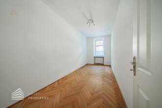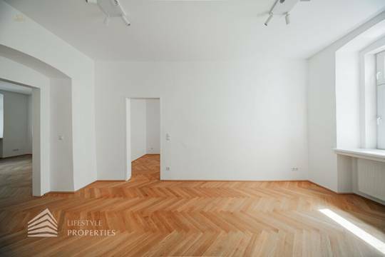 Die Wohnung befindet sich im 1. Stock und teilt sich in einen Vorraum, einen Wohnraum, drei Zimmer, eine Essdiele, eine Küche, ein Badezimmer und ein separates WC. Die Wohnräume sind mit einem schönen Parkettboden ausgestattet und die Nassräume sind verfliest. Beheizt wird mittels Gas-Etagenheizung.