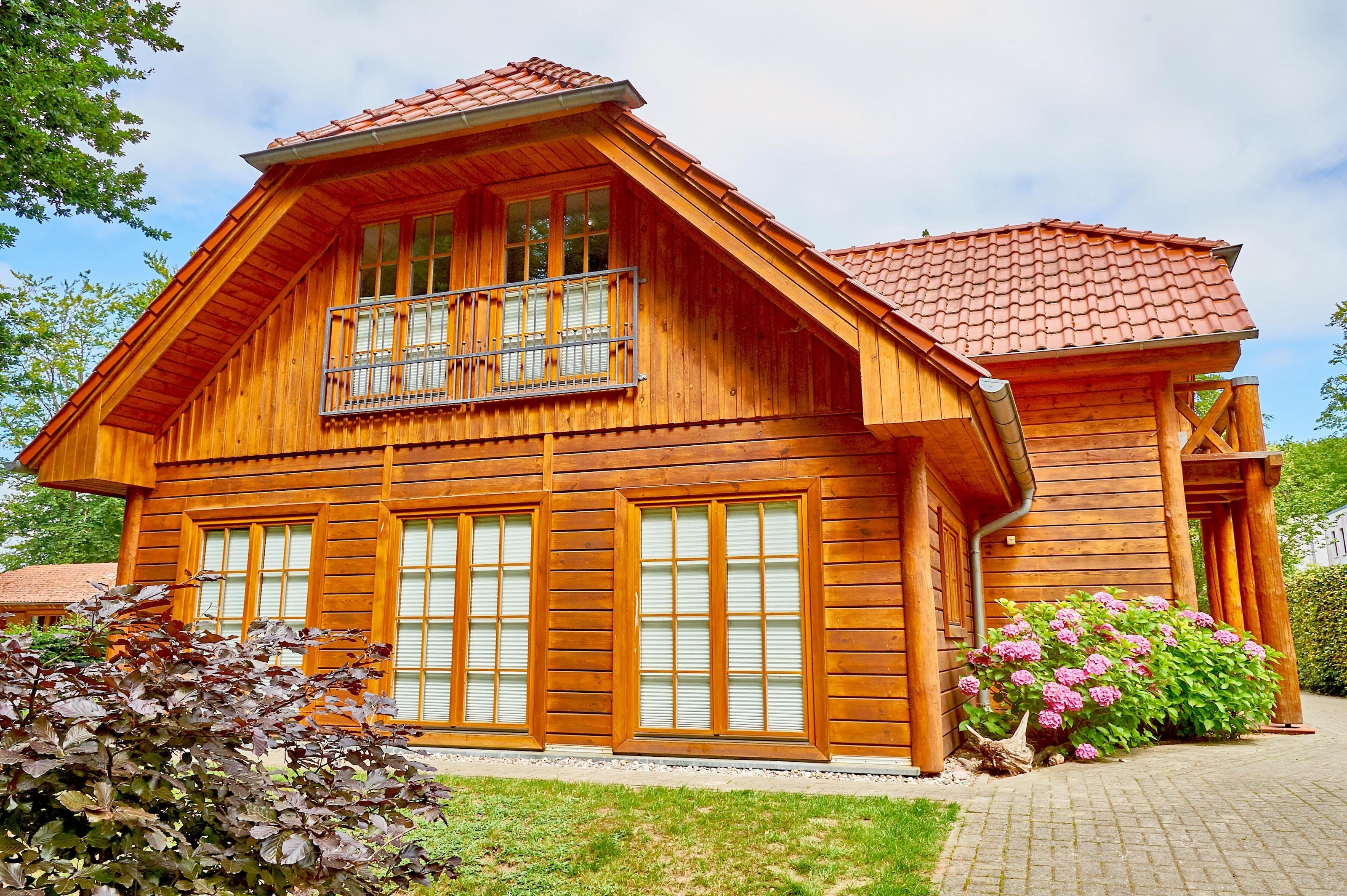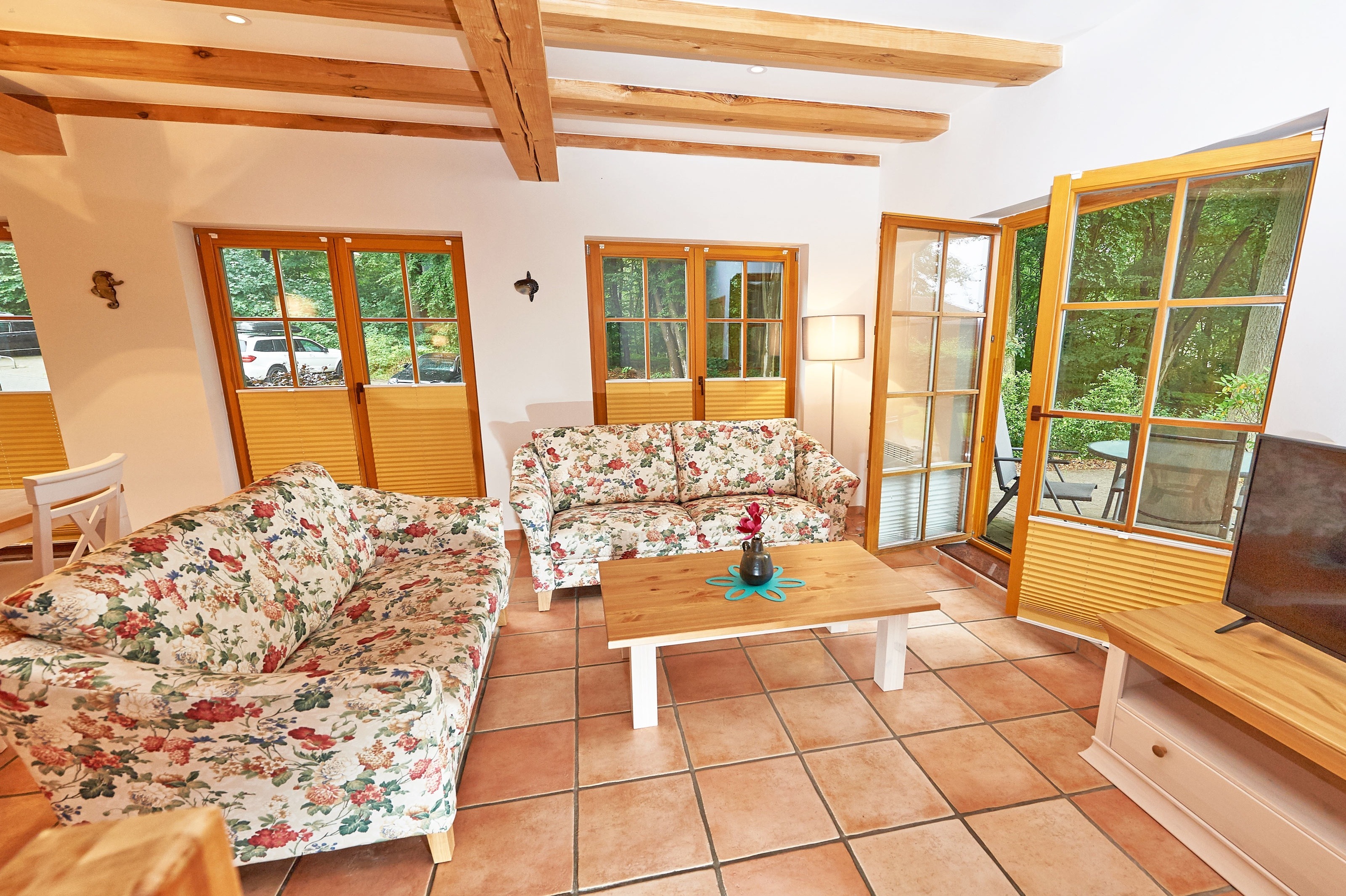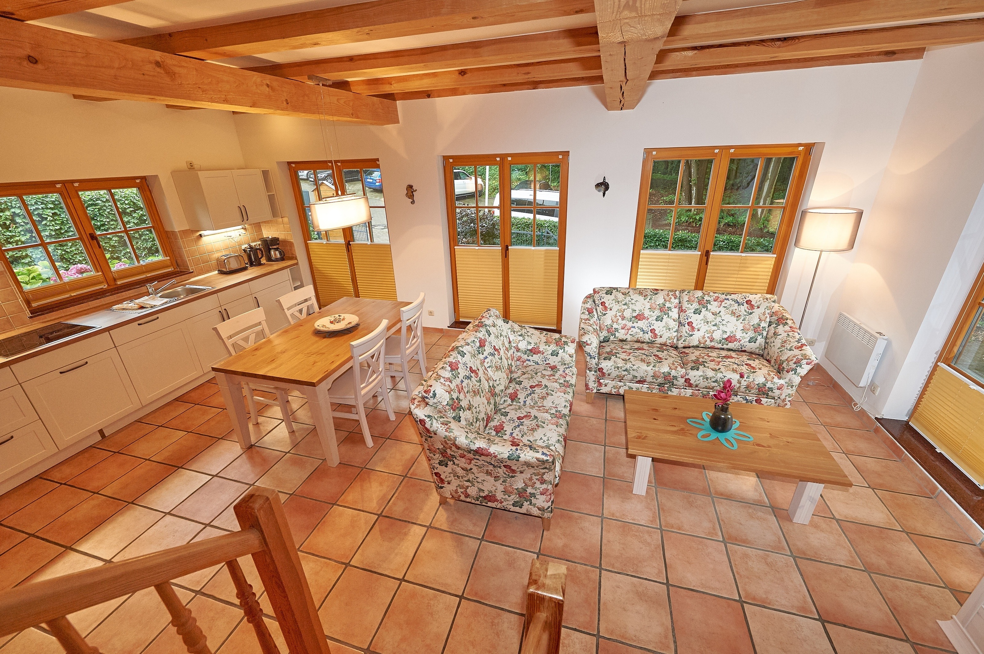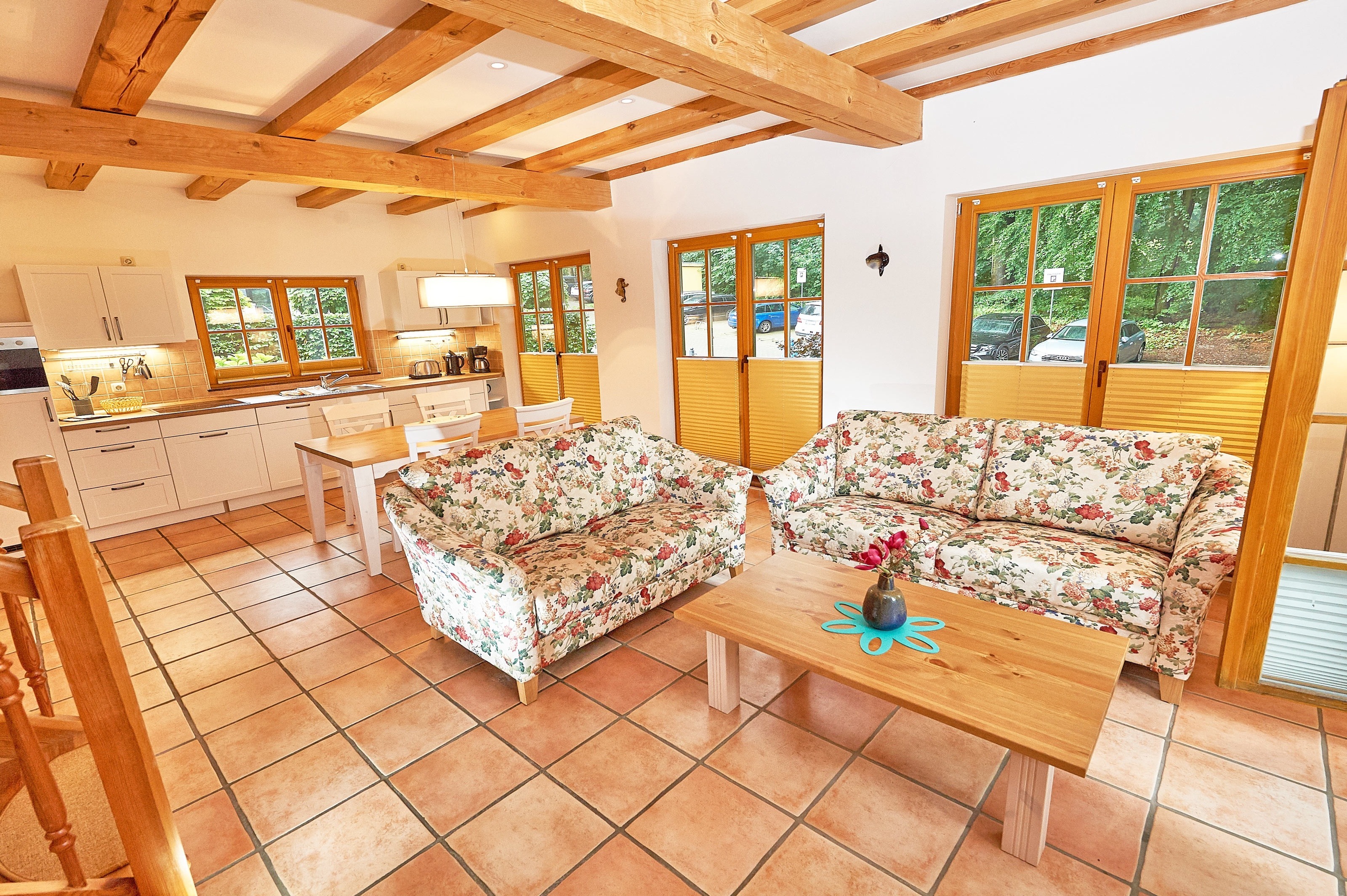 Jede der 4 Haushälften umfasst rund 83,2 m² Wohnfläche und erstreckt sich über zwei Ebenen. Das Interieur und die Grundausstattung unter offenen Holzbalken sind identisch: Im durchgehend gefliesten Erdgeschoss befindet sich der großzügige Wohn- und Essbereich mit Zugang zur ca. 16 m² große Terrasse in Westausrichtung. Die integrierte, 2020 in allen 4 Wohnungen erneuerte Küchenzeile verfügt über Cerankochfeld, Waschmaschine, Kühlschrank mit Gefrierfach, Spülmaschine, Mikrowelle und diverses Kleininventar. Ebenfalls im Erdgeschoss befindet sich das Duschbad mit Handtuchheizkörper. Im mit Dielen ausgelegten Obergeschoss befinden sich zwei Schlafzimmer - eines mit Doppelbett und zusätzlichem TV, ein weiteres mit zwei Einzelbetten und Zugang zum 3,9 m² großen Balkon. Auf dem 1057 m² großen, umzäunten Grundstück befinden sich weiterhin ein 2023 gebautes, ca. 13 m² großes Saunahaus, 4 PKW-Außenstellplätze und ein 2025 angelegter Grillplatz mit Steingutgrill. Die 4 Haushälften werden seit Fertigstellung im Jahr 2005 als haustierfreie Nichtraucher-Ferienwohnungen vermietet. Es erfolgt kein Einzelverkauf der Wohnungen oder Häuser.