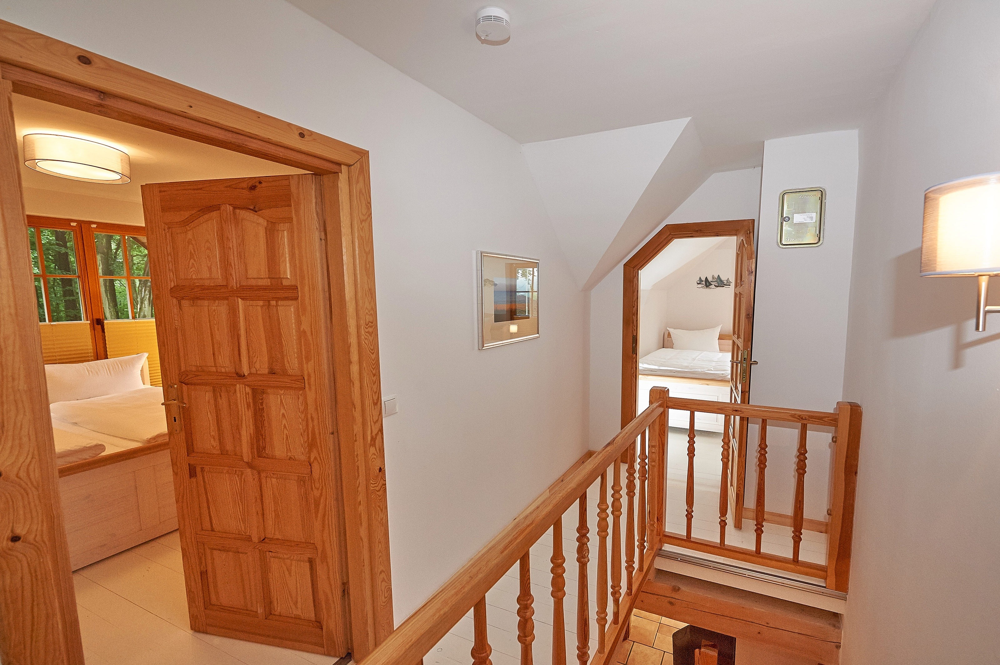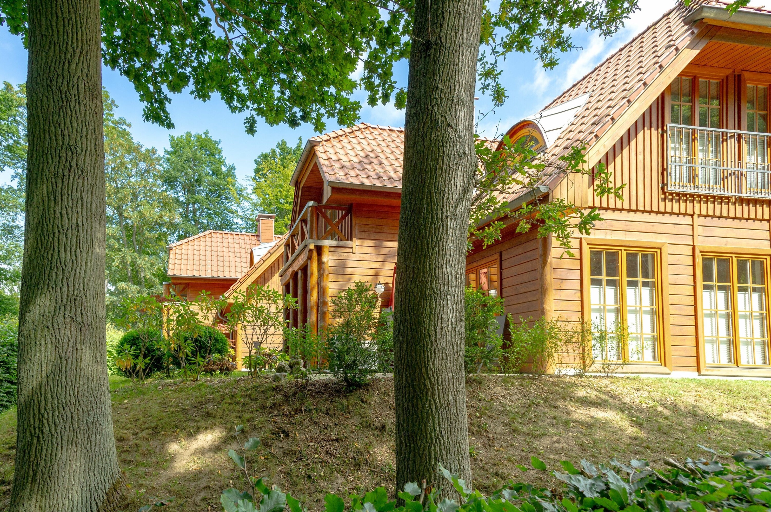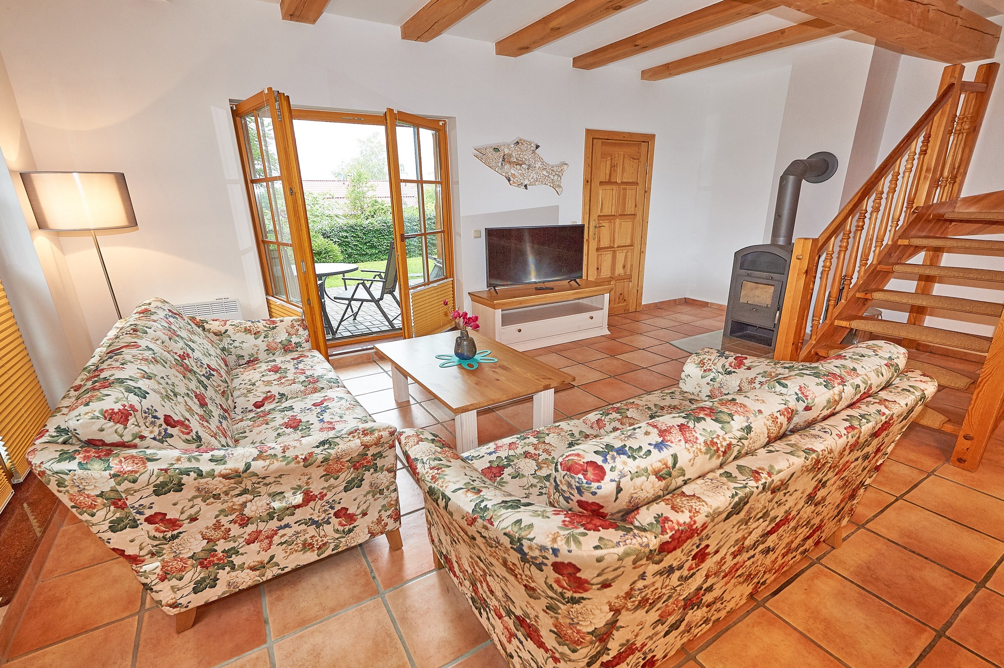 Jede der 4 Haushälften umfasst rund 83,2 m² Wohnfläche und erstreckt sich über zwei Ebenen. Das Interieur und die Grundausstattung unter offenen Holzbalken sind identisch: Im durchgehend gefliesten Erdgeschoss befindet sich der großzügige Wohn- und Essbereich mit Zugang zur ca. 16 m² große Terrasse in Westausrichtung. Die integrierte, 2020 in allen 4 Wohnungen erneuerte Küchenzeile verfügt über Cerankochfeld, Waschmaschine, Kühlschrank mit Gefrierfach, Spülmaschine, Mikrowelle und diverses Kleininventar. Ebenfalls im Erdgeschoss befindet sich das Duschbad mit Handtuchheizkörper. Im mit Dielen ausgelegten Obergeschoss befinden sich zwei Schlafzimmer - eines mit Doppelbett und zusätzlichem TV, ein weiteres mit zwei Einzelbetten und Zugang zum 3,9 m² großen Balkon. Auf dem 1057 m² großen, umzäunten Grundstück befinden sich weiterhin ein 2023 gebautes, ca. 13 m² großes Saunahaus, 4 PKW-Außenstellplätze und ein 2025 angelegter Grillplatz mit Steingutgrill. Die 4 Haushälften werden seit Fertigstellung im Jahr 2005 als haustierfreie Nichtraucher-Ferienwohnungen vermietet. Es erfolgt kein Einzelverkauf der Wohnungen oder Häuser.