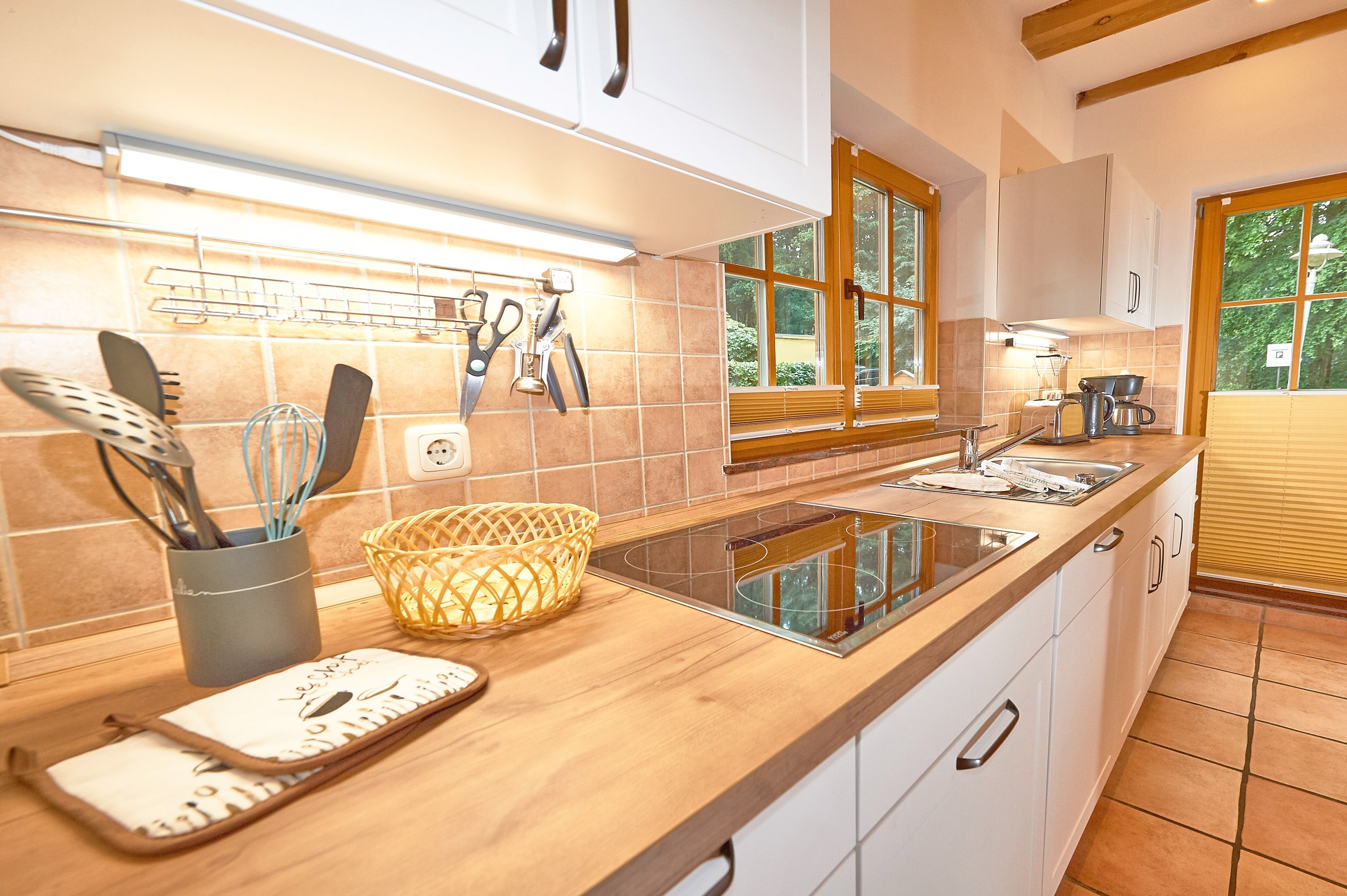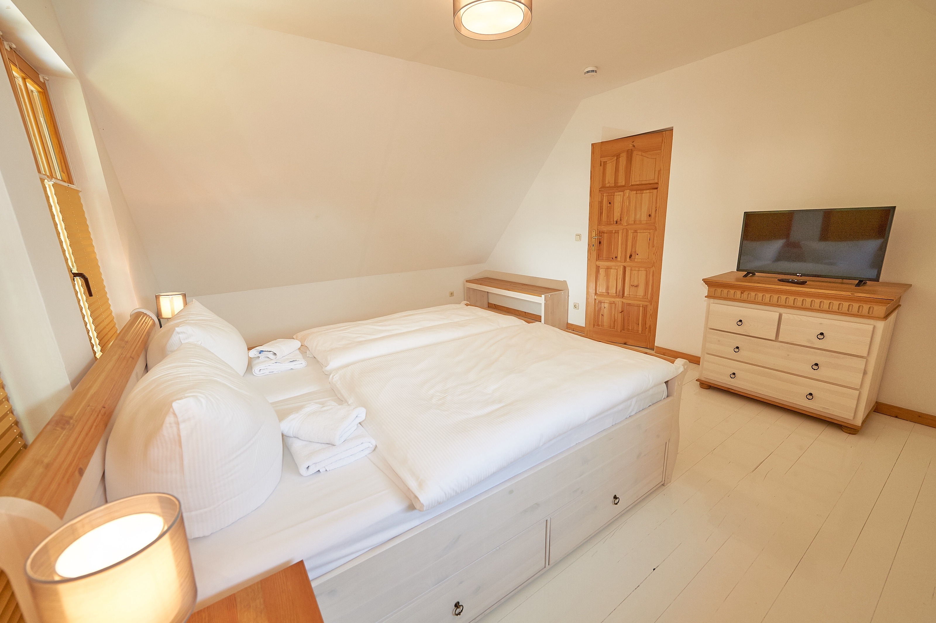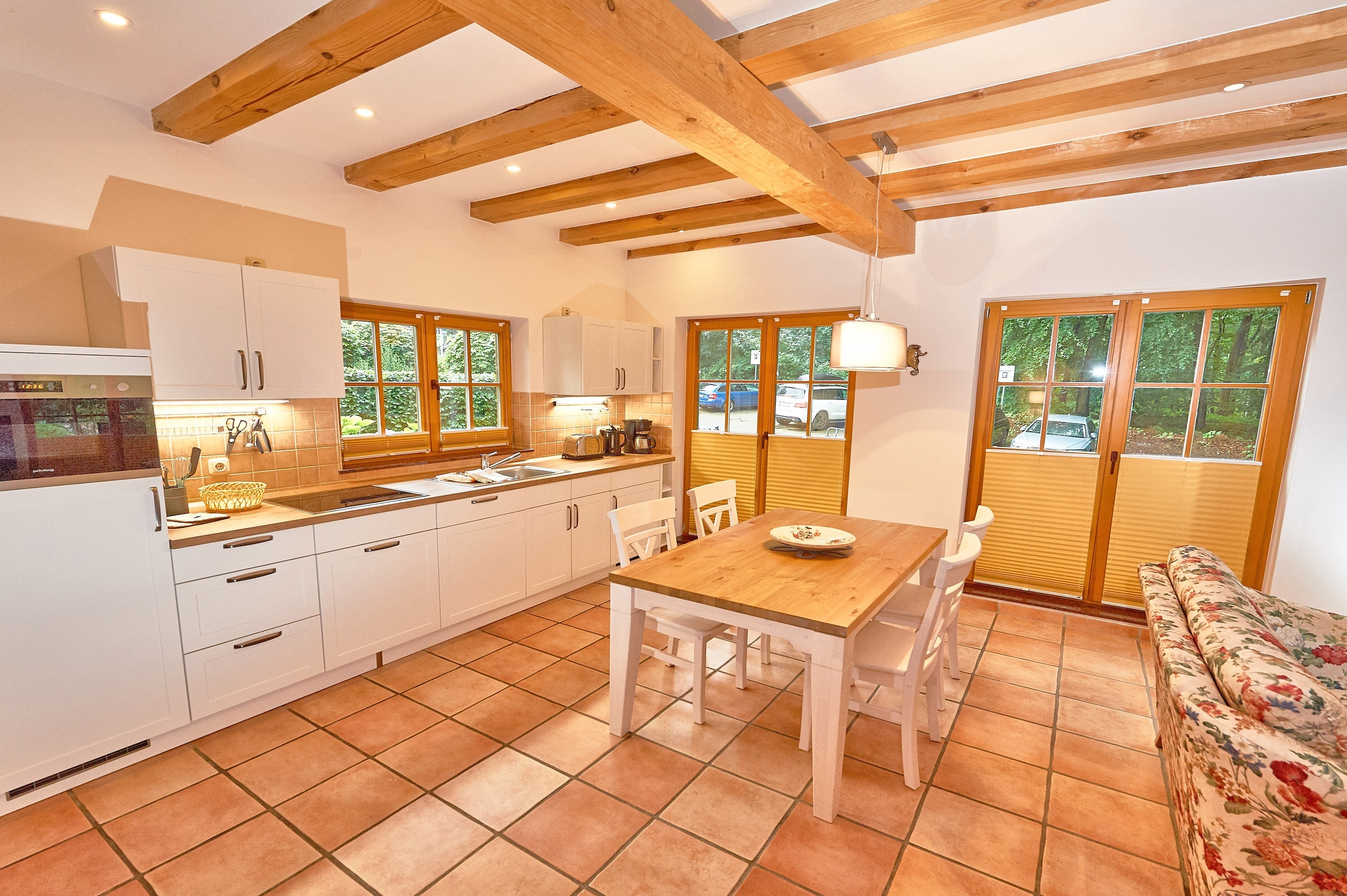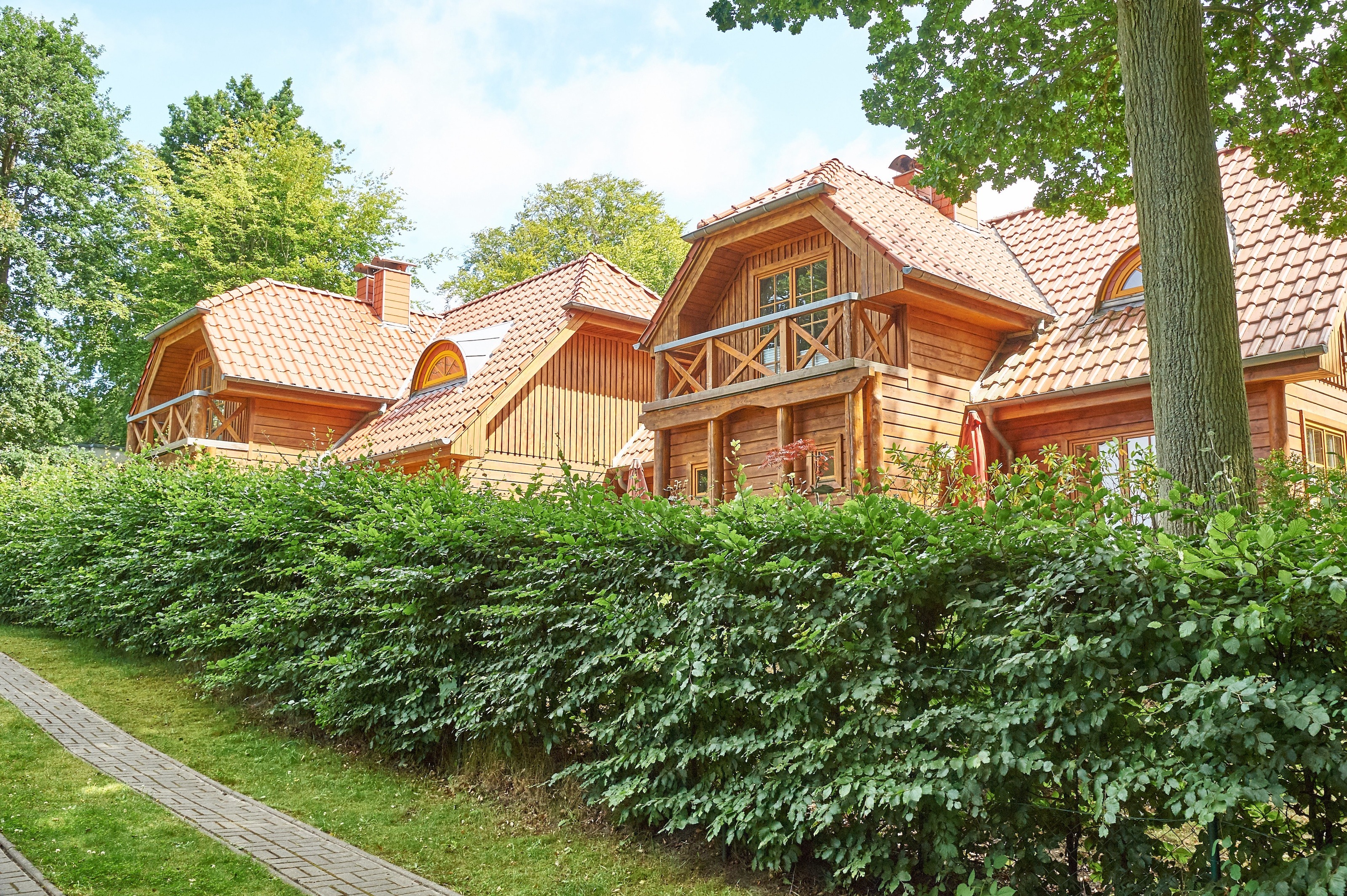 Jede der 4 Haushälften umfasst rund 83,2 m² Wohnfläche und erstreckt sich über zwei Ebenen. Das Interieur und die Grundausstattung unter offenen Holzbalken sind identisch: Im durchgehend gefliesten Erdgeschoss befindet sich der großzügige Wohn- und Essbereich mit Zugang zur ca. 16 m² große Terrasse in Westausrichtung. Die integrierte, 2020 in allen 4 Wohnungen erneuerte Küchenzeile verfügt über Cerankochfeld, Waschmaschine, Kühlschrank mit Gefrierfach, Spülmaschine, Mikrowelle und diverses Kleininventar. Ebenfalls im Erdgeschoss befindet sich das Duschbad mit Handtuchheizkörper. Im mit Dielen ausgelegten Obergeschoss befinden sich zwei Schlafzimmer - eines mit Doppelbett und zusätzlichem TV, ein weiteres mit zwei Einzelbetten und Zugang zum 3,9 m² großen Balkon. Auf dem 1057 m² großen, umzäunten Grundstück befinden sich weiterhin ein 2023 gebautes, ca. 13 m² großes Saunahaus, 4 PKW-Außenstellplätze und ein 2025 angelegter Grillplatz mit Steingutgrill. Die 4 Haushälften werden seit Fertigstellung im Jahr 2005 als haustierfreie Nichtraucher-Ferienwohnungen vermietet. Es erfolgt kein Einzelverkauf der Wohnungen oder Häuser.
