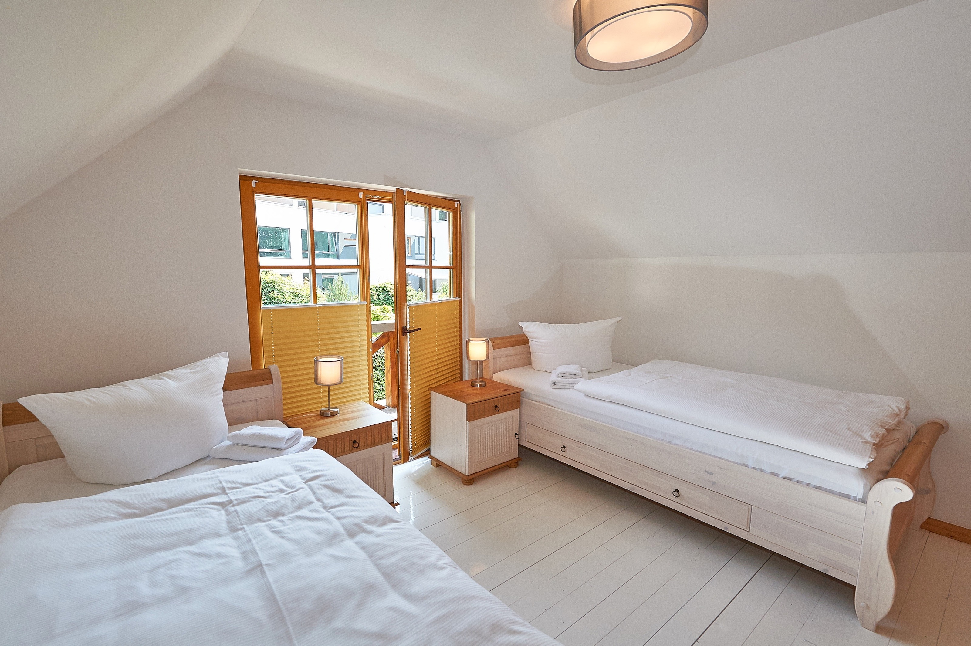 Das Ostseebad Sellin residiert inmitten Rügens südöstlicher Bäderküste. Die urigen Häuser mit ihren insgesamt 4 Wohneinheiten liegen am buchenbewaldeten Hochufer direkt über dem Selliner Südstrand. Bis hinunter zum Wasser sind es nur knapp 300 m Fußweg. Bei auflandigem Wind hört man in den Wohnungen deutlich das Meer rauschen. Der Strand zieht sich von hier ca. 6 km lang über Baabe bis nach Göhren. Richtung Westen trifft man auf den Selliner See mit seinem neugebauten Hafen und verschiedensten Wassersportmöglichkeiten. Bis zur nächsten Bushaltestelle sind es ca. 300 m, bis zum nächstgrößeren Bahnhof in Binz rund 15 Kilometer. Aufgrund der zentralen Lage im Ort sind Apotheke, Einkaufsmarkt, diverse Arztpraxen, Bäcker, Drogerie, Sparkasse, sowie mehrere Cafés und Restaurants fußläufig erreichbar.
