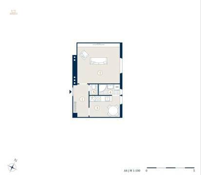 Sie betreten die Wohnung und befinden sich im Vorraum. Linkerhand gelangen Sie in den Wohn- Schlafraum. Des Weiteren gelangen Sie vom Vorraum in die voll ausgestattete Küche und in das Bad mit Fenster. Dieses ist mit einer Dusche und einem Waschbecken ausgestattet. Das separate WC ist auch vom Vorraum erreichbar.