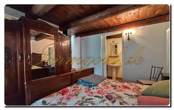 Gegenüber, getrennt vom Garten und der Pergola, befindet sich der Wohnbereich, der im Erdgeschoß in eine Zweizimmerwohnung und in den oberen Stockwerken in eine Maisonette-Wohnung mit Wohnküche, Arbeitszimmer, Bad und zwei Schlafzimmern unterteilt ist. Im Erdgeschoss befinden sich auch ein geräumiger Holzschuppen und der Keller. Die Außentreppe aus Stein verbindet die verschiedenen Ebenen und führt dann weiter zum letzten Gebäude, das als Backofen und Trockenraum genutzt wird.