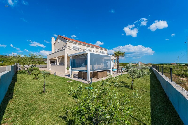 Besonders von der großen Terrasse im ersten Stockwerk genießt man einen schönen Blick auf die Umgebung bis hin zum Meer. Die Grundstücksfläche beträgt 900 m² und auf dieser befindet sich ein Swimmingpool mit Liegebereich mit Pergola / über5dachten Essbereich, ein Grill und mehrere Stellplätze. Die Distanz zum nächsten Ortskern beträgt circa 800 m und zum Meer sind es ca. 2 km.