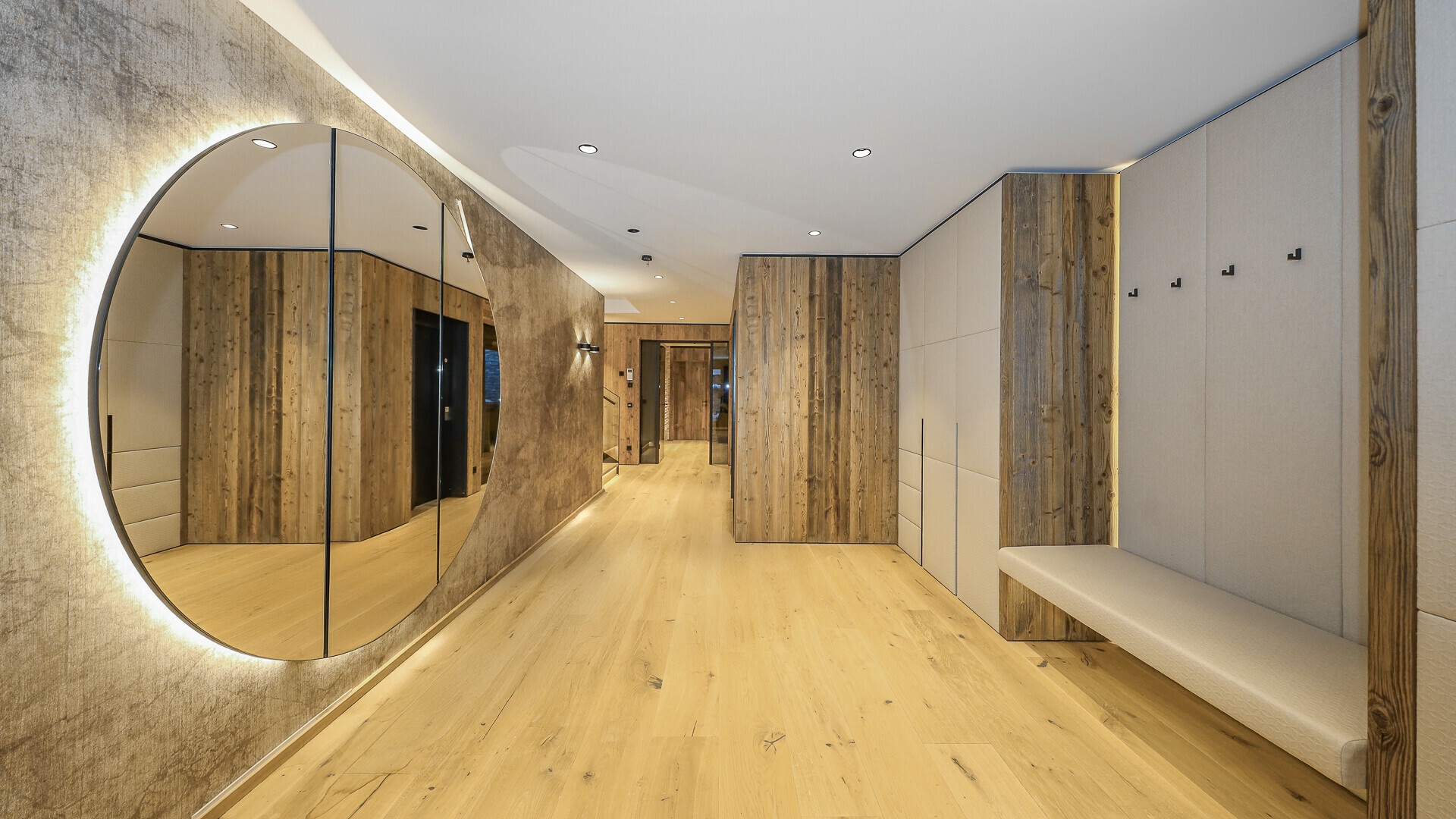 Über den Hauseingang oder durch die Garage gelangt man in die geräumige Garderobe mit zahlreichen Einbauschränken und angrenzendem Hauswirtschaftsraum. Ein Schlafzimmer mit Badezimmer en suite und Ausgang auf einen Lichthof sowie der Wellnessbereich mit Dusche, WC, Sauna und ebenfalls Zugang in einen Lichthof mit Whirlpool befinden sich ebenfalls auf dieser Ebene.