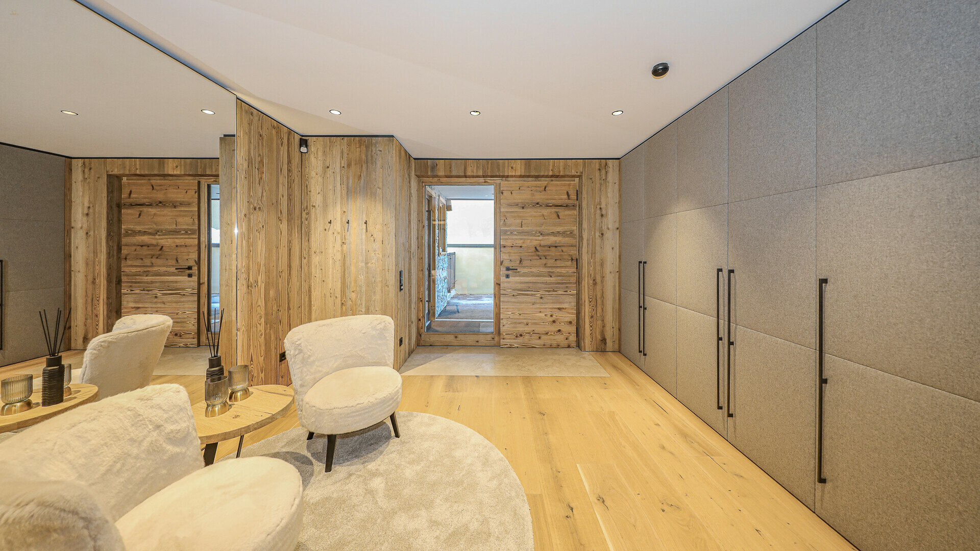 Über den Hauseingang oder durch die Garage kommt man in den repräsentativen Eingangsbereich mit zahlreichen Einbauschränken und angrenzendem Hauswirtschaftsraum sowie zusätzlichem Abstellraum. Ein Schlafzimmer mit Badezimmer en suite und Ausgang auf einen Lichthof sowie der große Wellnessbereich mit Dusche, WC, Sauna, Bereich für Fitnessgeräten und ebenfalls Zugang in einen Lichthof mit Whirlpoolanschluss, befinden sich ebenfalls auf dieser Ebene.