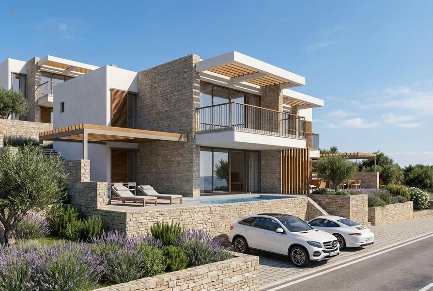 Diese vier Neubau-Villen werden aktuell in nur ca. 50 Metern Entfernung zum Meeresufer fertiggestellt. Hochwertige Baumaterialien, eine Kombination aus mediterranen und modernen Elementen mit großen Glasfronten.