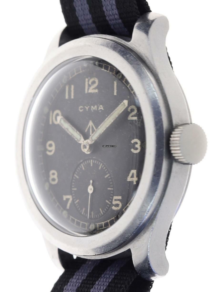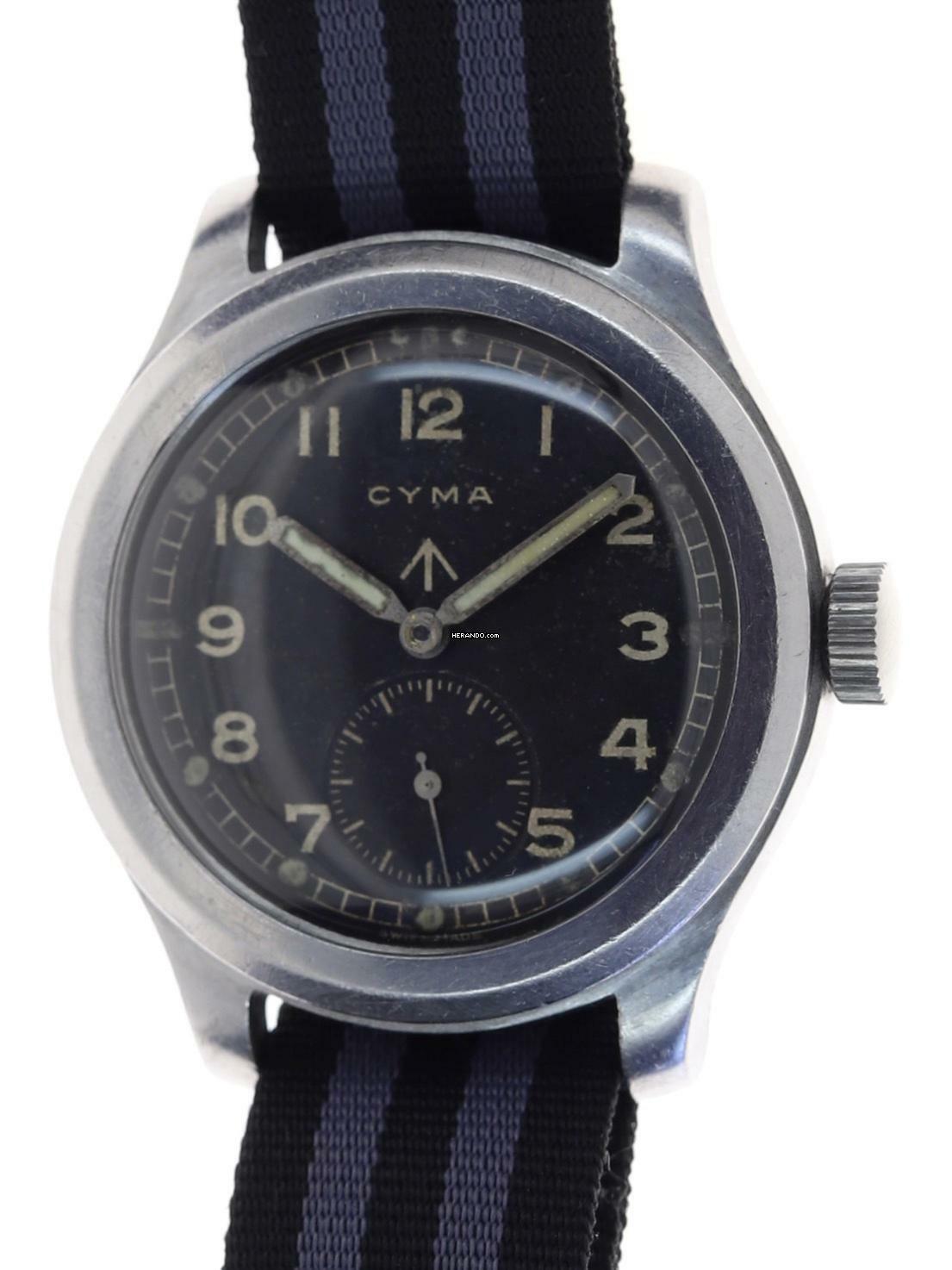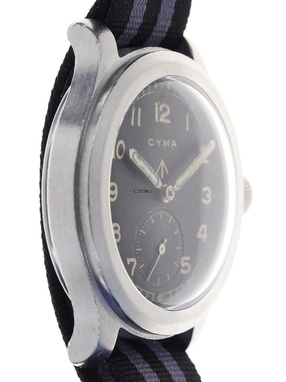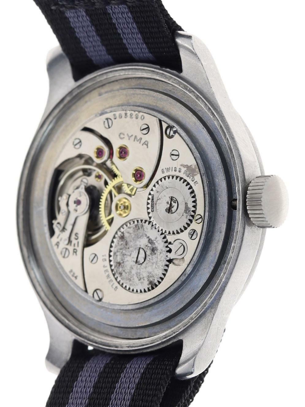 Bemerkungen: diese Cyma gehört zum "Schmutzigen Dutzend", einer Gruppe von 12 Uhren mit ähnlichem Design, die von britischen Soldaten während des Zweiten Weltkriegs getragen wurden und vom britischen Verteidigungsministerium bei 12 Firmen in Auftrag gegeben wurden. Jedes Unternehmen lieferte so viele Uhren, wie es seine Produktion zuließ. Cyma hat während des Zweiten Weltkriegs nur etwa 20.000 Uhren für die britische Armee hergestellt.