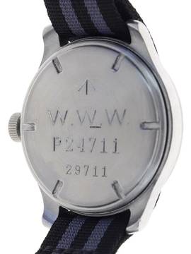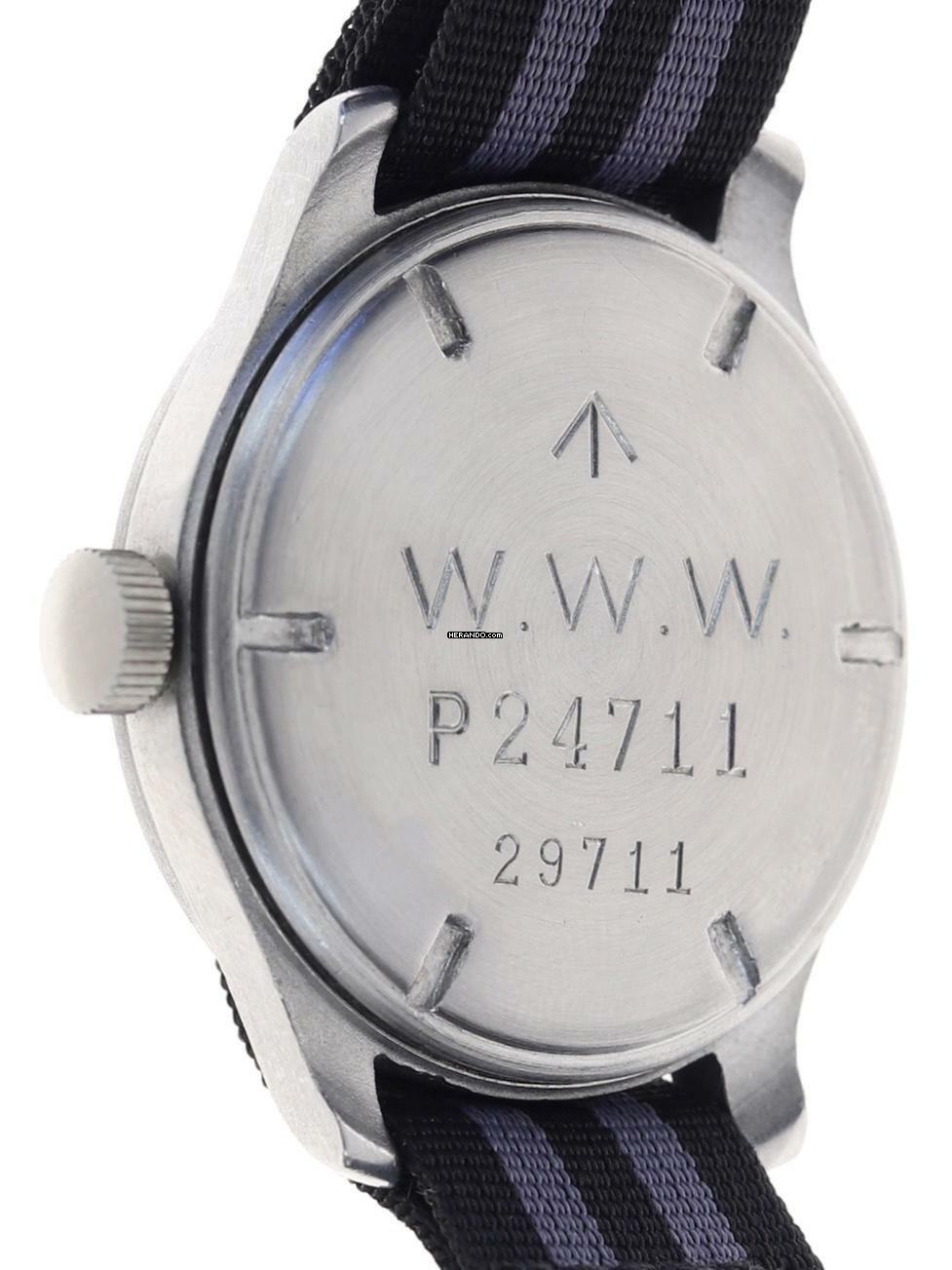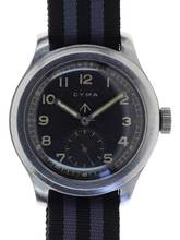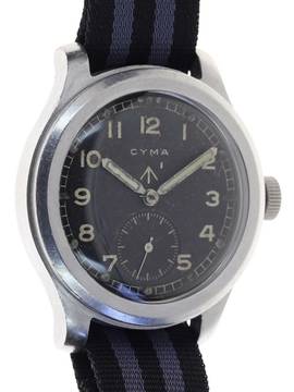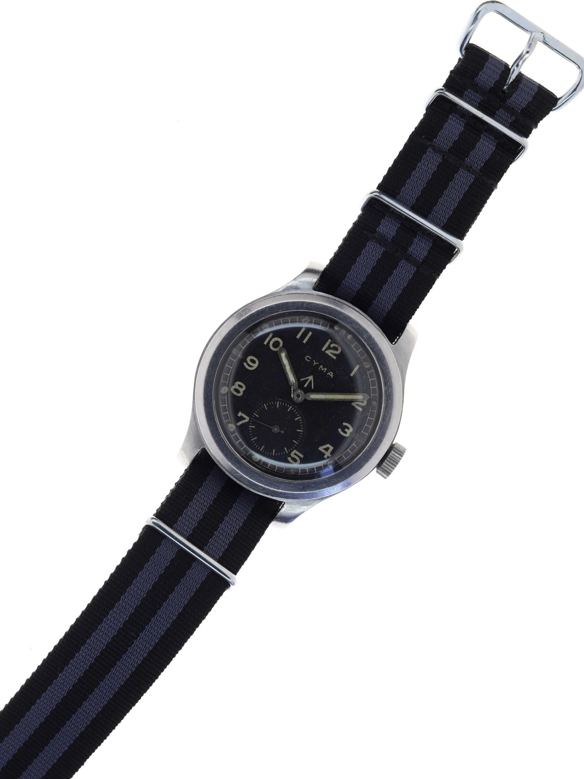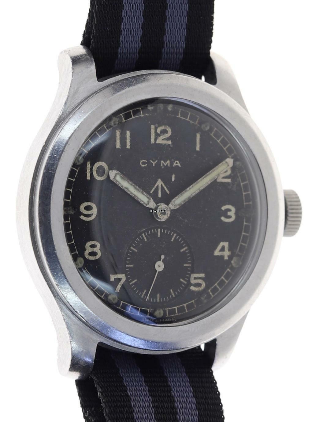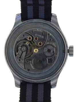 Bemerkungen: diese Cyma gehört zum "Schmutzigen Dutzend", einer Gruppe von 12 Uhren mit ähnlichem Design, die von britischen Soldaten während des Zweiten Weltkriegs getragen wurden und vom britischen Verteidigungsministerium bei 12 Firmen in Auftrag gegeben wurden. Jedes Unternehmen lieferte so viele Uhren, wie es seine Produktion zuließ. Cyma hat während des Zweiten Weltkriegs nur etwa 20.000 Uhren für die britische Armee hergestellt.