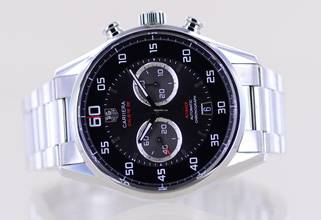 Diese Uhr ist recht selten zu sehen und ist ein technischer und optischer Leckerbissen. Das Kaliber 36 / El Primero ist als Schnellschwinger legendär und ein Stück Uhrengeschichte. Auf dieses Basis lässt sich die mechanische 10-tel-Sekundenmessung vollziehen, die bei Tag Heuer sehr hoch angesehen ist. Darüber hinaus verfügt die Uhr noch über die Flyback-Funktion, die ein Nullen des Chronos ohne Stoppen ermöglicht.Von vorne schaut man auf einen sportlichen Chronographen mit zentraler Stoppsekunde. Dynamisch wirkt die farbliche Gestaltung des Zifferblattes mit einem äußeren schwarzen Ring für die Ziffern und silbrig-grauem Grund für die Totalisatoren: Die kleine Sekunde läuft permanent auf 9 Uhr und die Stoppminute auf 3 Uhr. Das Datum liegt auf 6 Uhr und fügt sich gut ein. Auf der Rückseite überzeugt die Tag Heuer mit dem Blick in das El Primero Werk und dessen Automatik-Aufzugsmechanismus. Dahinter liegt die schnell schwingende Unruhe (36.000 A/h) mit einer schönen Brücke. Der Rotor ist bei diesem Modell skelettiert und trägt die Tag Heuer Calibre 36 Beschriftung.