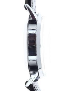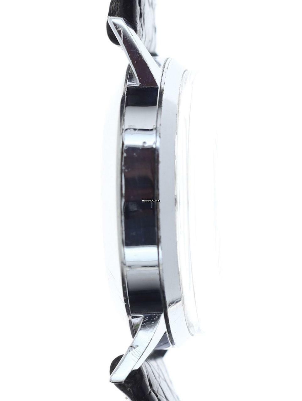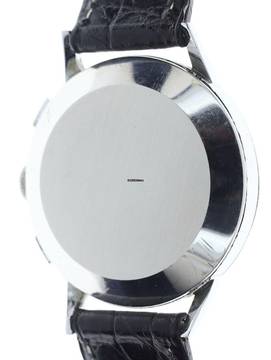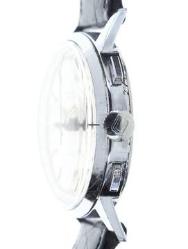 Band / Schließe: schwarzes, leicht gebrauchtes, unsigniertes Lederband mit unsignierter Edelstahl-Dornschließe, nachträglich an der Uhr angebracht