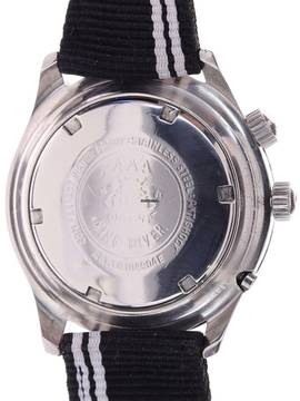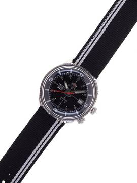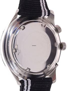 Band / Schließe: unbenutztes Nylonband, nachträglich an der Uhr angebracht, Dornschließe aus Edelstahl