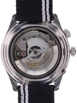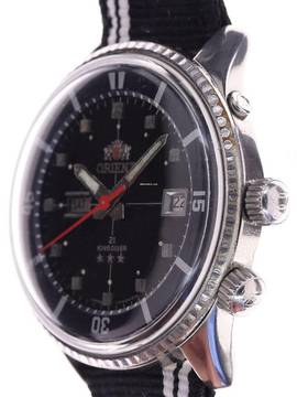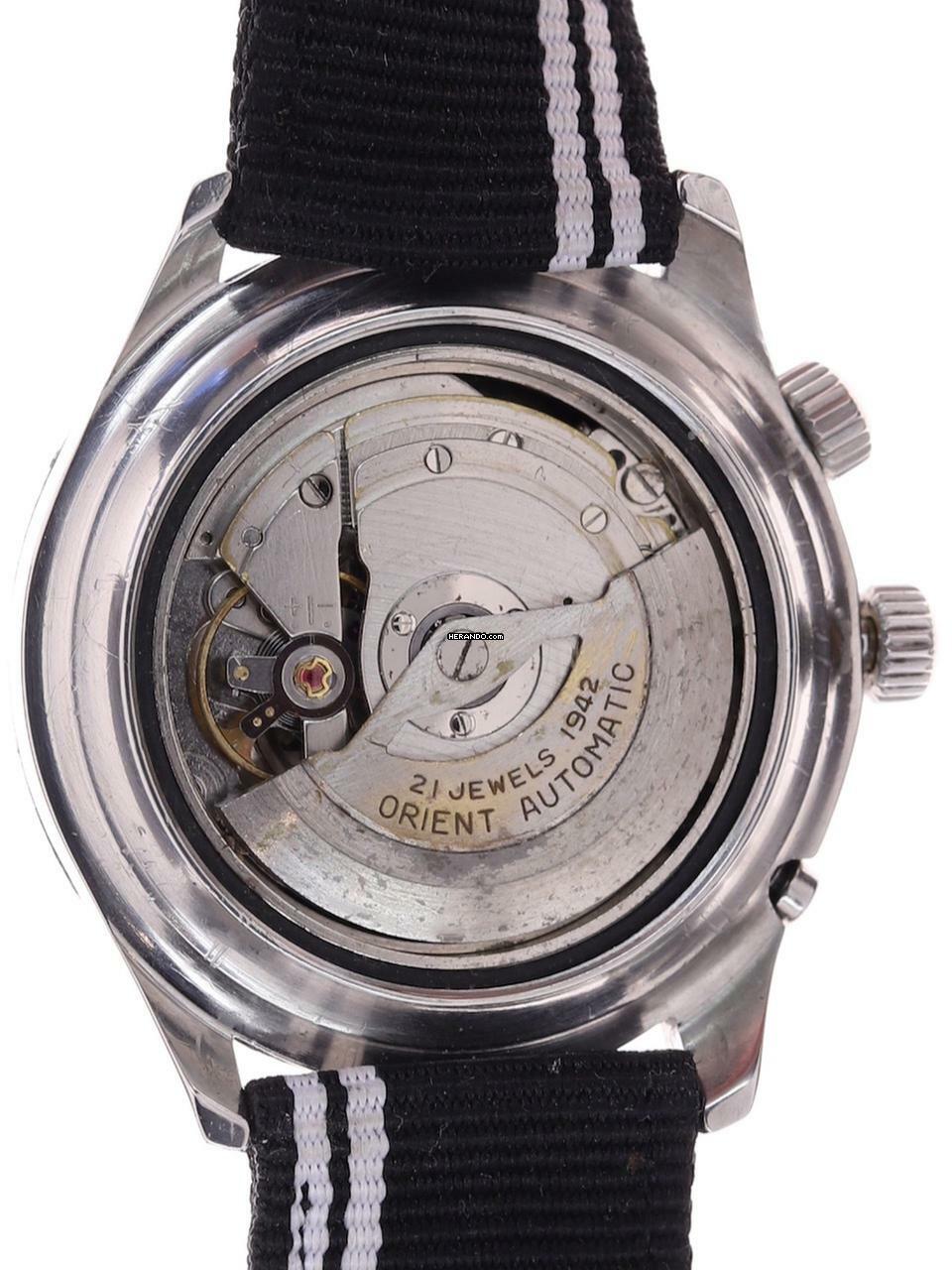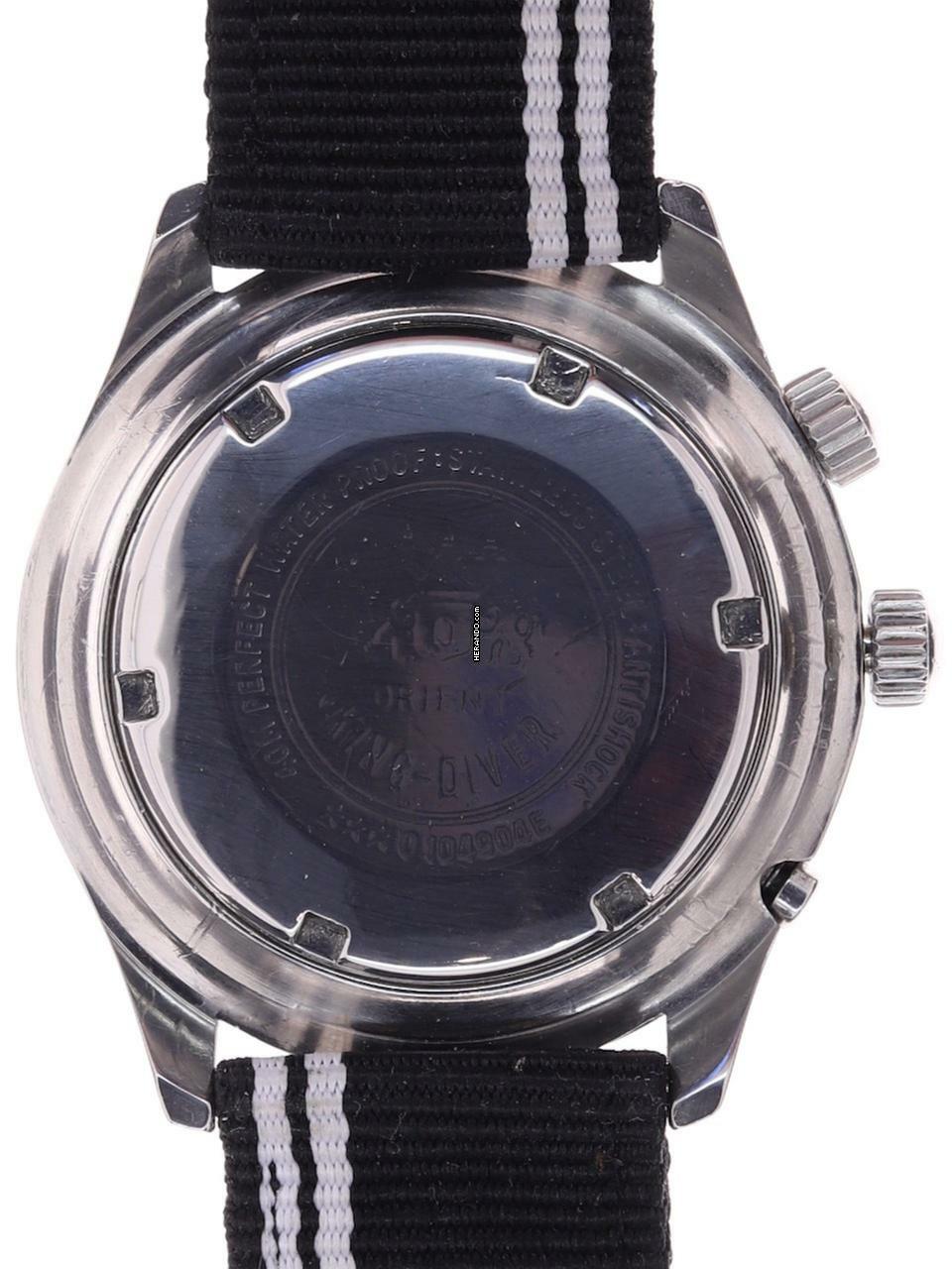 Zifferblatt: schwarz glänzendes Original-Zifferblatt, aufgesetzte Stahlmarkierungen, Leuchtpunkte, Stahl-Leuchtzeiger, rote Sekundenanzeige, Datumsfenster und zusätzliches Fenster für den Wochentag, aufgesetztes Orient-Logo