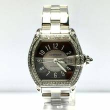 Case: Domed Glossy Stainless Steel set with Custom Natural Diamonds, stamped Cartier Roadster, Automatic, Stainless Steel, Water Resistant 100m 330ft, 2510 and Serial Number
