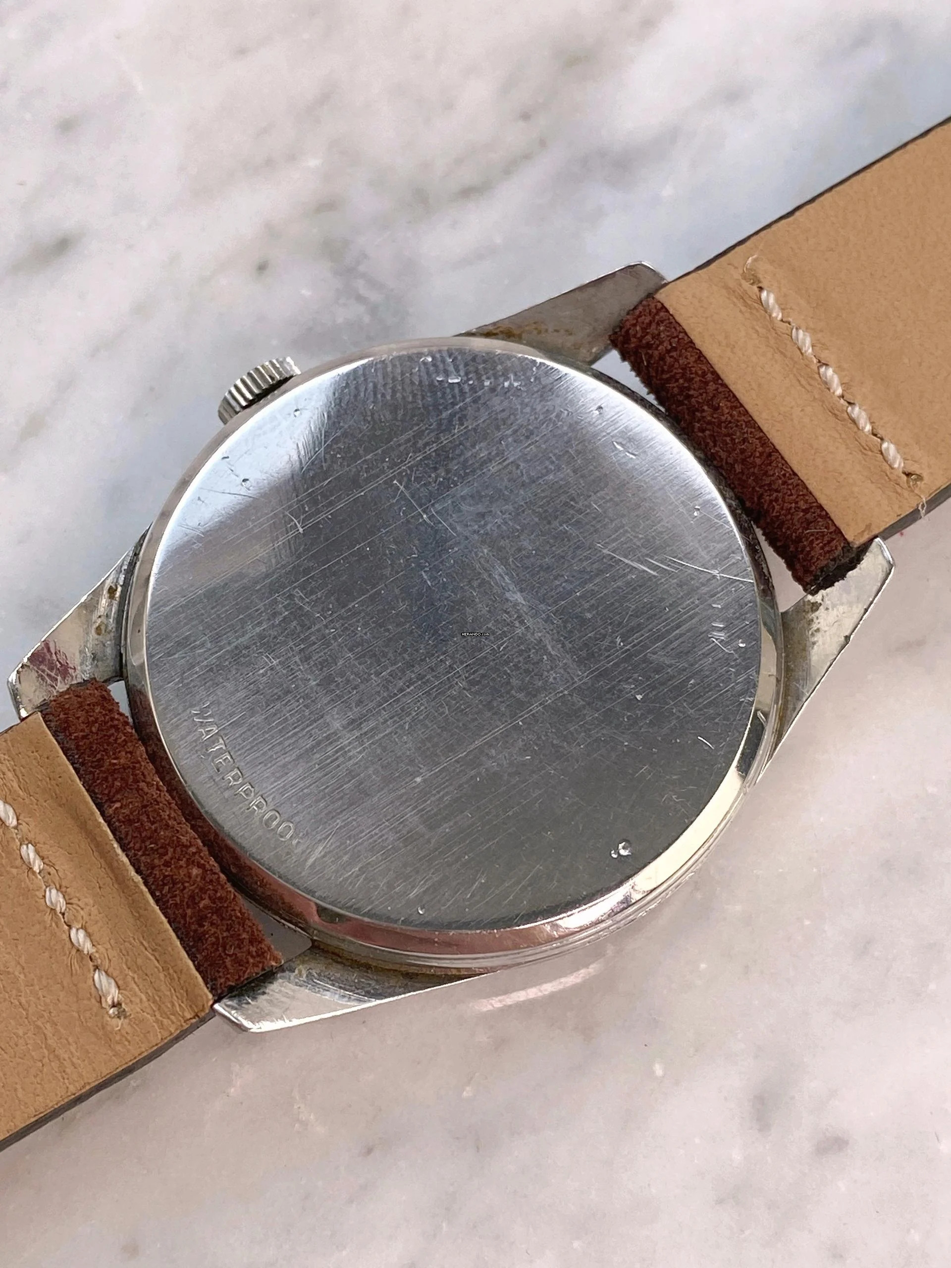 - The still FACTORY ORIGINAL (non-refurbished) dial has some patina matching its age.