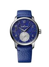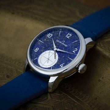 Durchbrochener Lapislazuli, geschliffener Opalinenzähler (Mattsilber) bei 6 Uhr, glänzende Silberindexe, anthrazitfarbene Transfers auf dem Zähler und weiße Transfers auf dem Lapislazuli-Teil