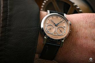 eigenes Manufaktur-Handaufzugswerk, versetzte Stunde und Minute