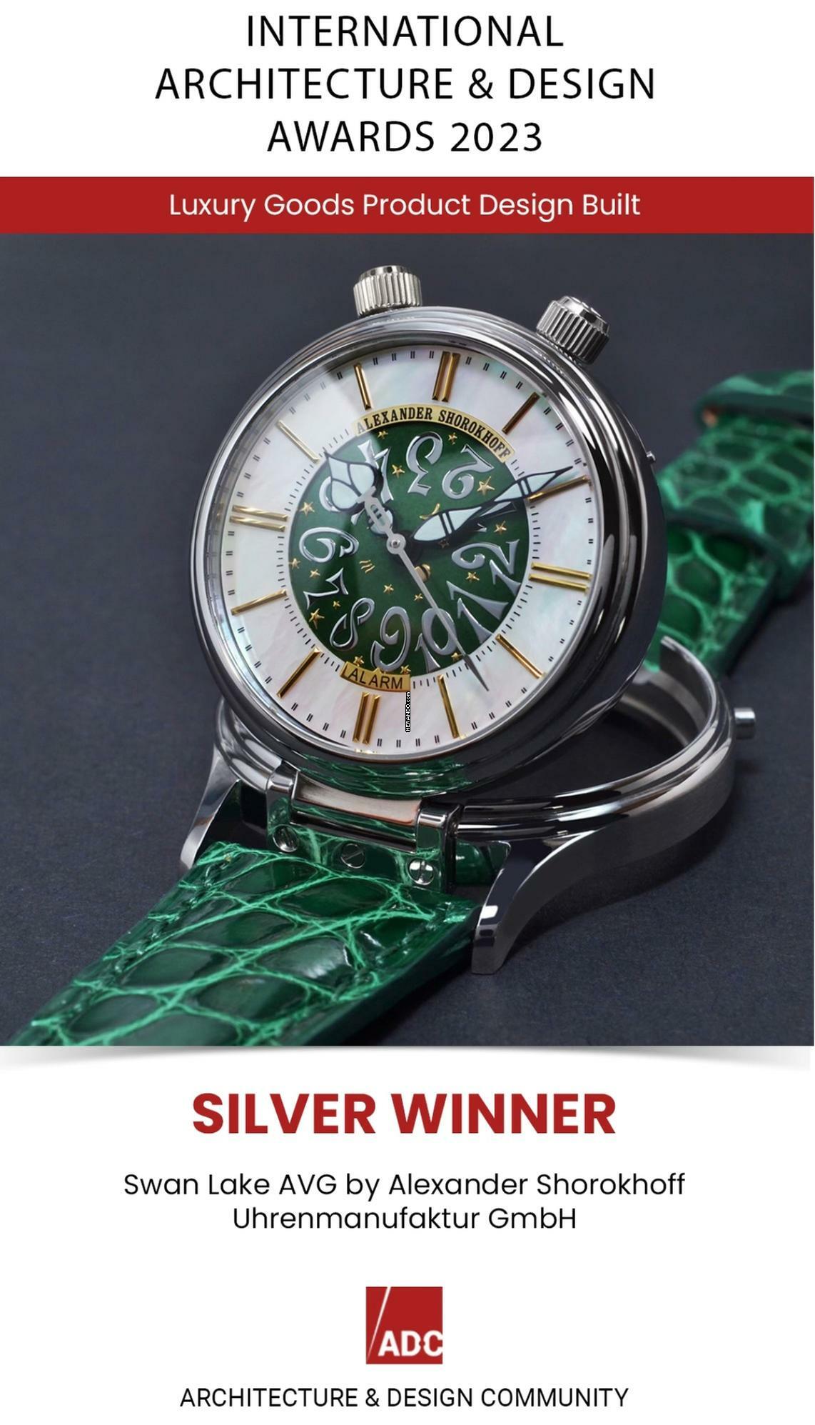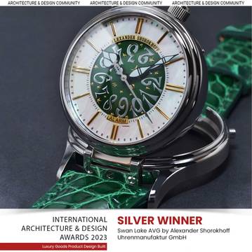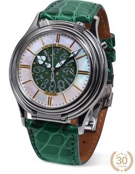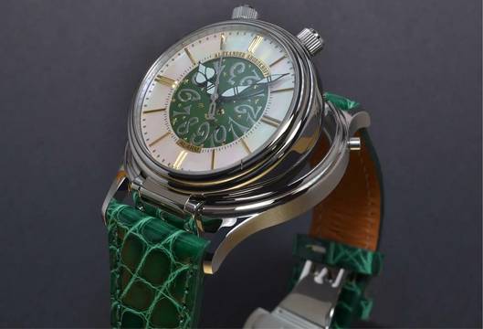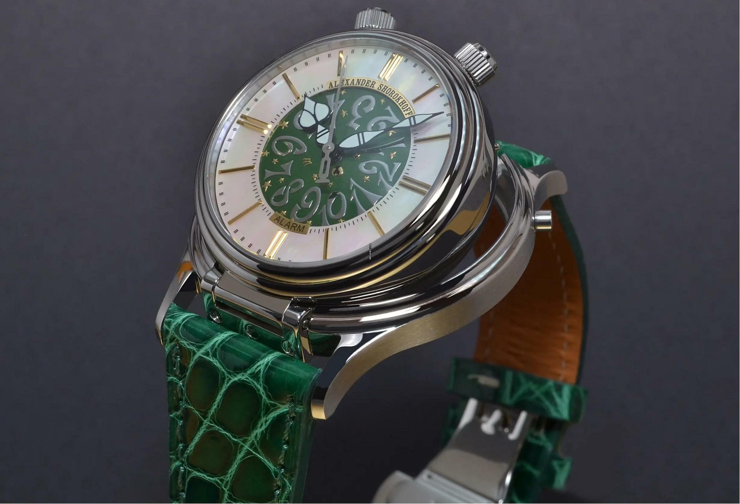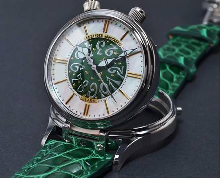 Perlmuttring mit gelb vergoldeten Applikationen, drehbare Weckscheibe in Grün mit silberfarbenen Zahlen