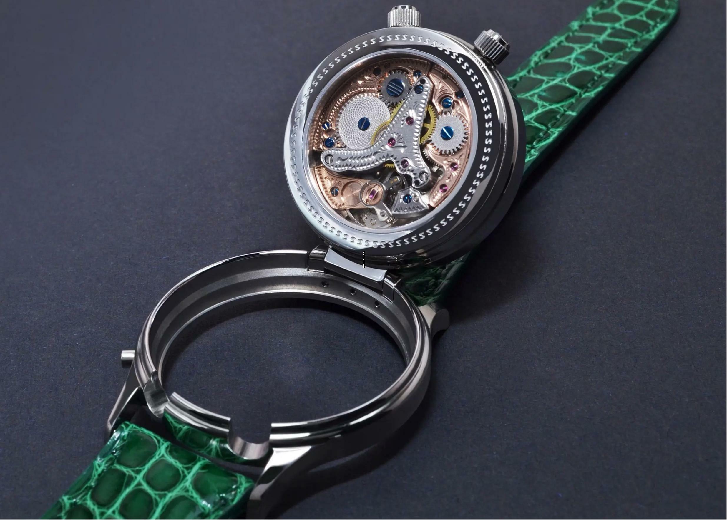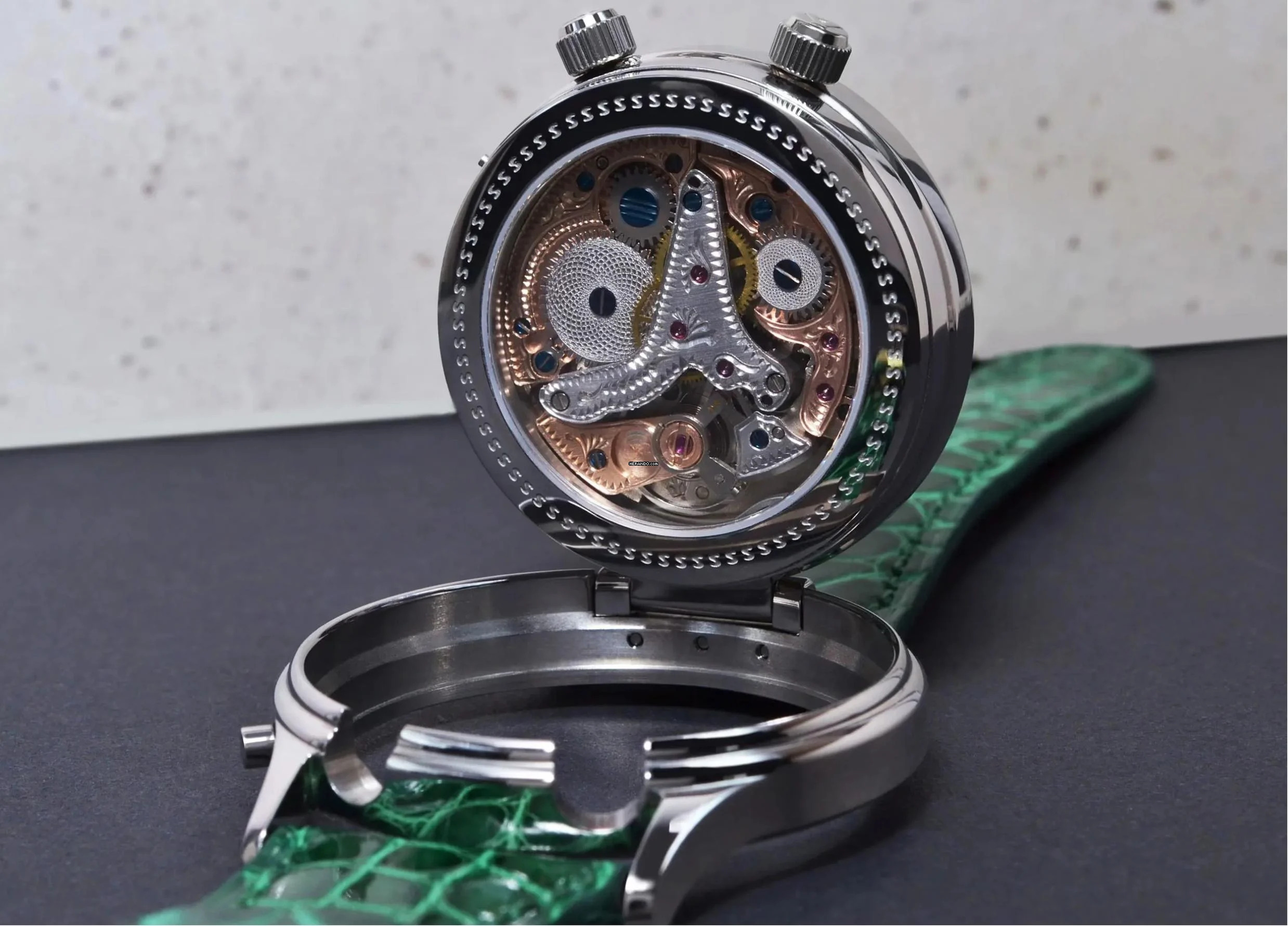 Aufklappbares Doppelgehäuse aus Edelstahl, mit Saphirglasboden
