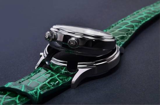 Stunden, Minuten, Zentralsekunde, Wecker bedienbar über die Krone bei 11 Uhr