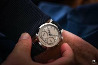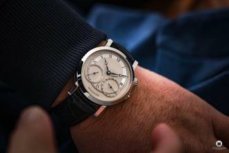 eigenes Manufaktur-Handaufzugswerk, versetzte Stunde und Minute