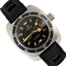 Titus Calypsomatic 8375 Diver mit Datum Big Crown Stahl, Baujahr ca. 1967, bidirektionale Stahllünette, schwarzer Aluminiumeinsatz mit Skala 60, Kunststoffglas gewölbt, mattschwarzes Zifferblatt mit Roulette-Datum, Indexe und Zeiger auf Tritium original der Epoche, automatisches mechanisches Uhrwerk, schwarzes Kautschukarmband mit generischer Stahlschließe.
