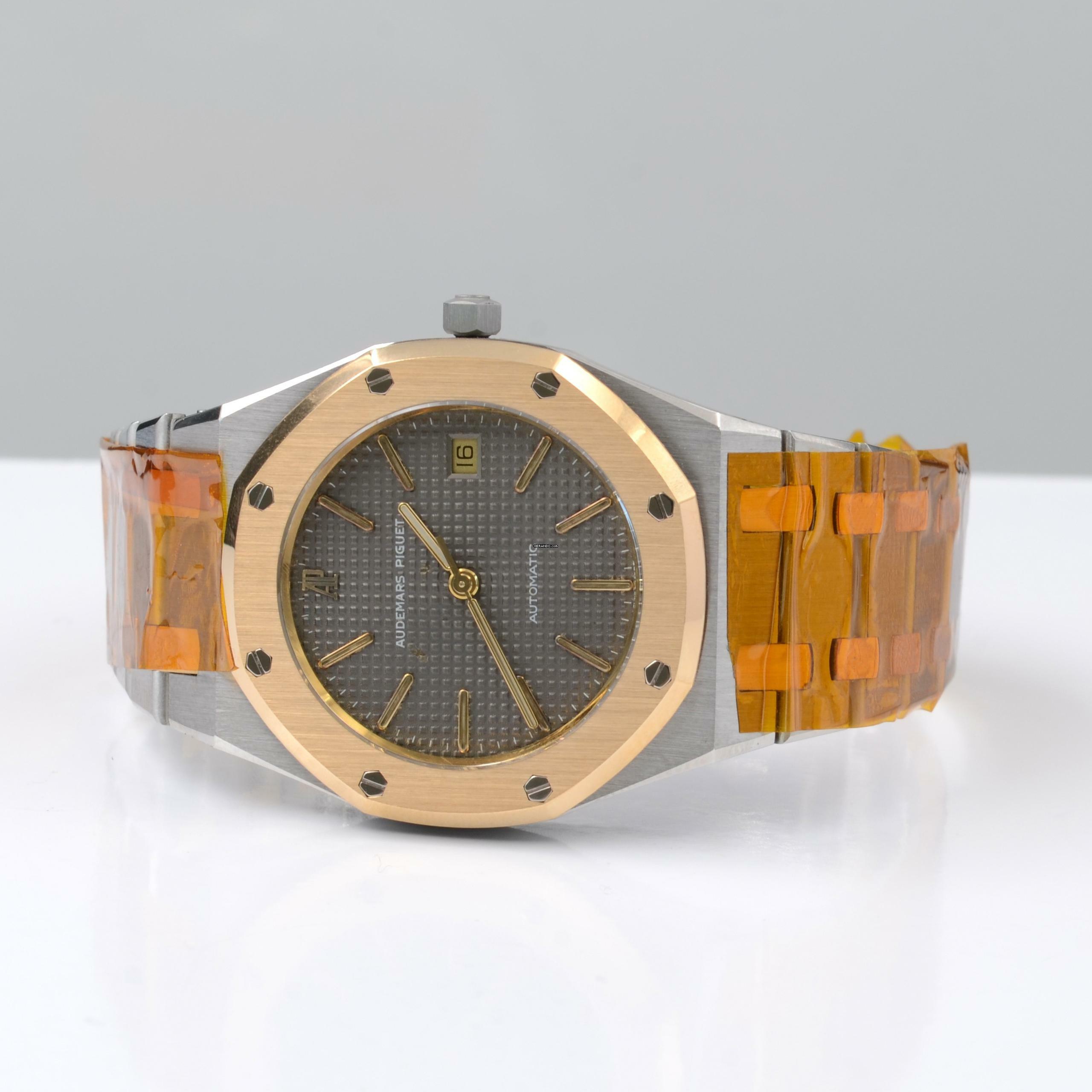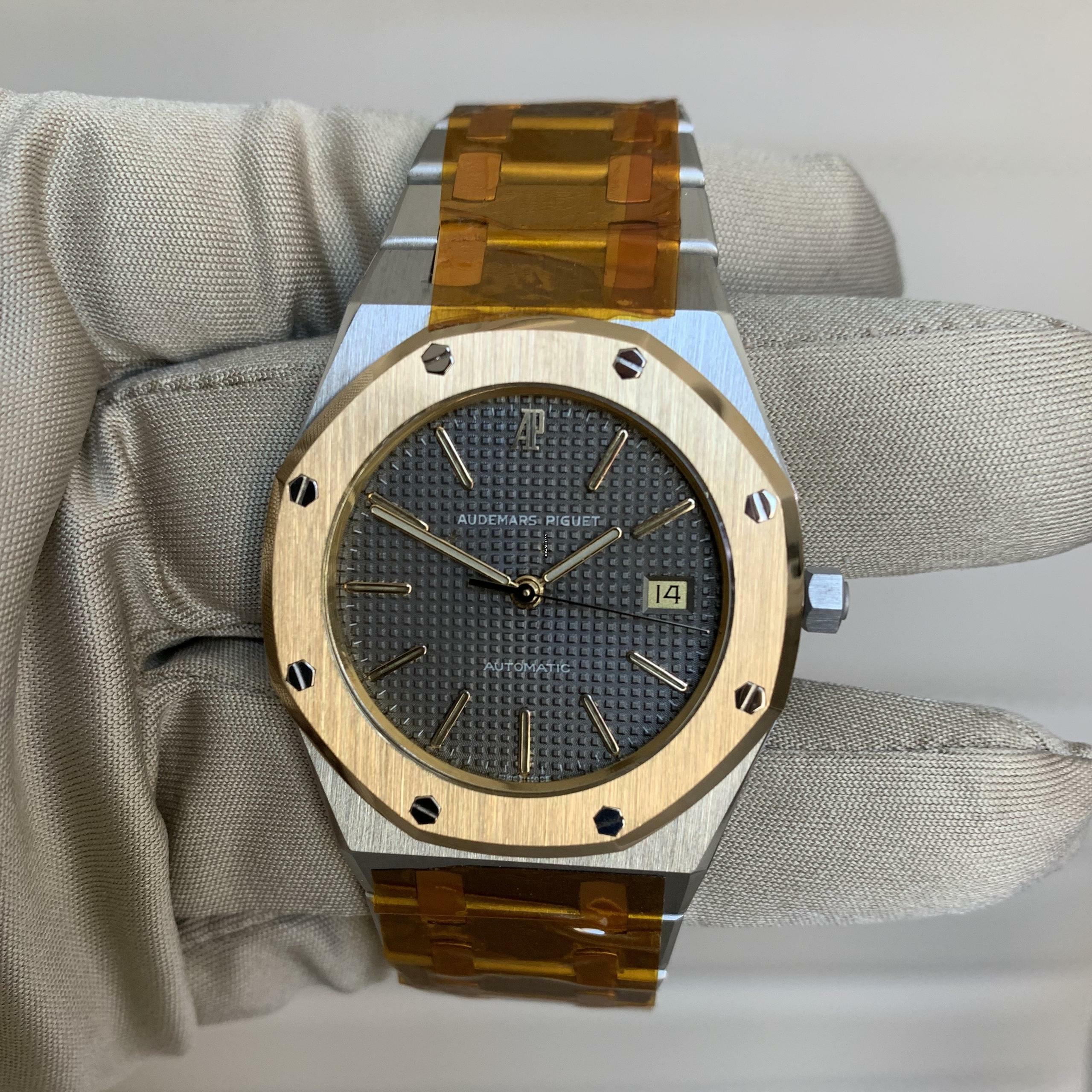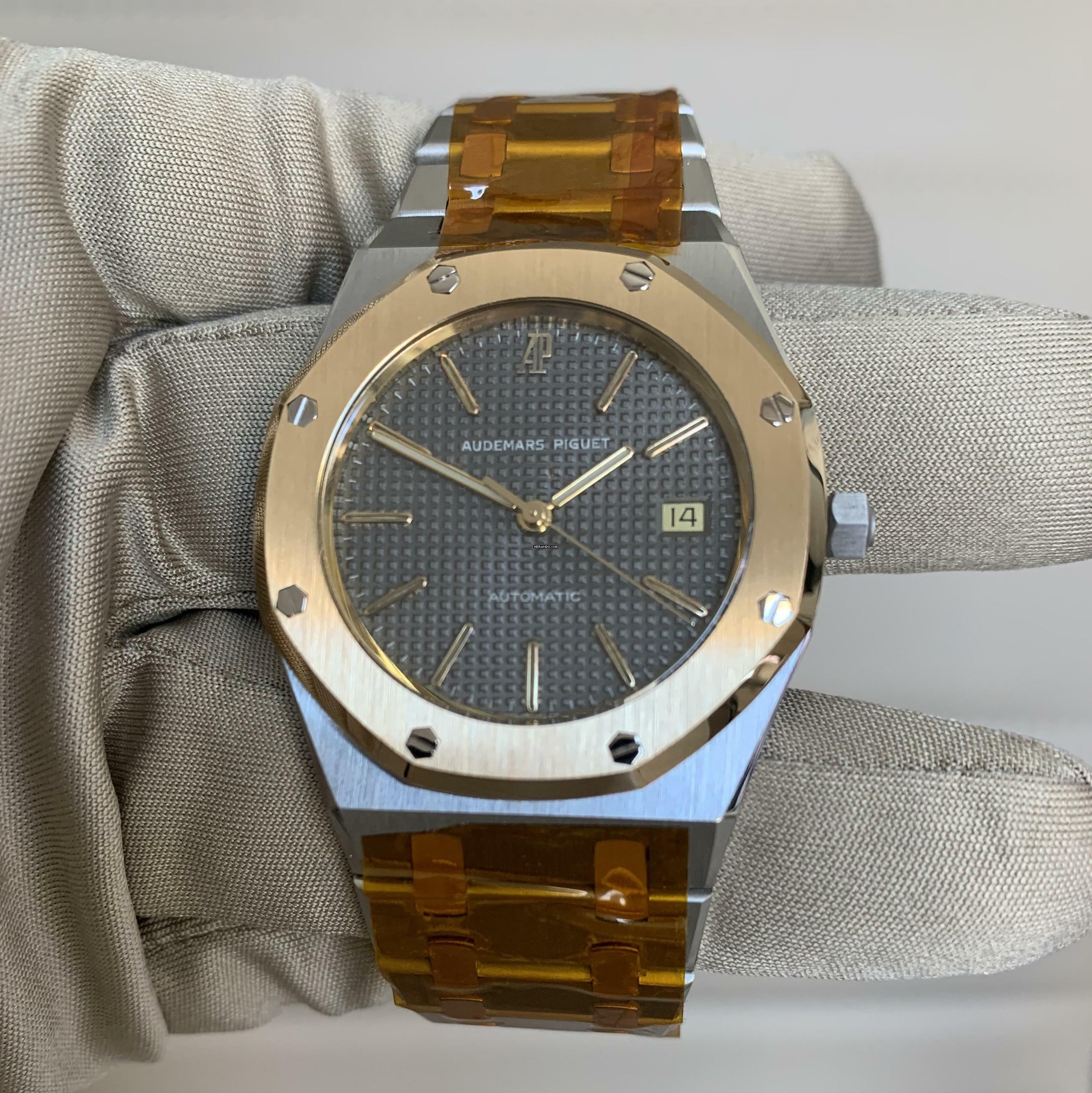 Audemars Piguet Royal Oak 36MM Stahl und Gelbgold 18KT, Produktionsjahr 1993, Gelbgold 18KT achteckige Lünette, Saphirglas entspiegelt, petite tapisserie graue Farbe Zifferblatt mit Datum, Indizes und Zeiger auf Gelbgold 18KT, automatische mechanische Bewegung, Stahl und Gelbgold 18KT Armband mit deployante Audemars Piguet (für maximale Handgelenkumfang 19CM).