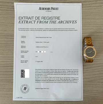 Offizieller Auszug aus dem Archiv Audemars Piguet vom 11. April 2023